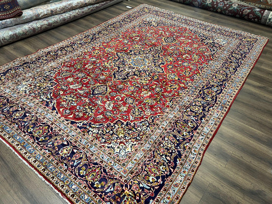 Persian Kashan Rug 9x12, Red Navy Blue, Allover Floral Medallion & Corner Design, Handmade Wool Oriental Carpet, Semi Antique Traditional Carpet
