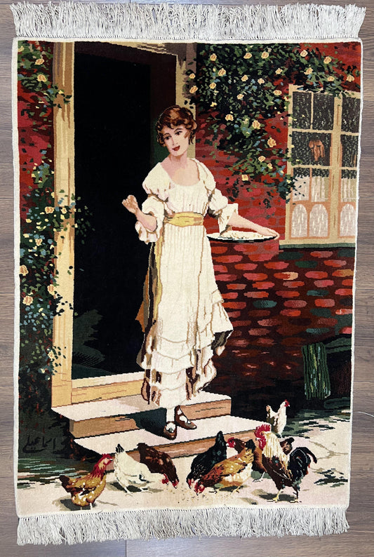 Persian Tabriz Pictorial Rug 2x3, Fine High KPSI Pictorial Carpet, Lady in Front of Home with Chickens 2 x 3 ft Oriental Rug Vintage Handmade Wool