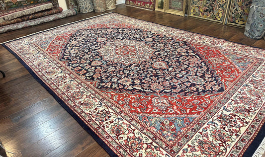 Indo Persian Rug 10x15, Floral Allover, Handmade Vintage Wool Carpet, Dark Blue Ivory Red, Palace Size Traditional Rug