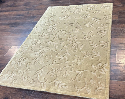 Modern Tibetan Rug 3.7 x 5.5, Carved Floral Design, Wool and Silk Highlights