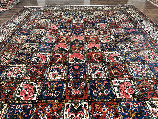 Persian Bakhtiari Rug 10x14, Wool Hand Knotted Vintage Carpet, Multicolor Khesti Panel Design, Large Room Sized Semi Antique Oriental Rug 10 x 14