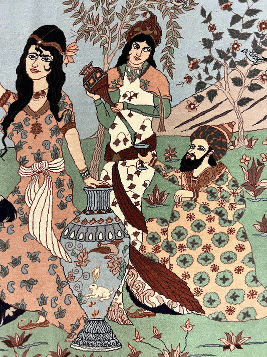 Indo Persian Pictorial Rug 4x7, Handmade Hand Knotted Wool Semi Antique Horizontal Carpet, Men & Women Drinking, Fine Rug, Bird Pictorials