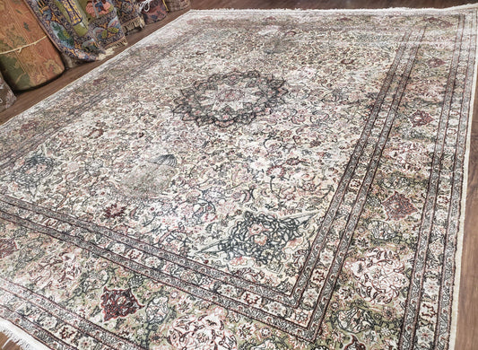 Vintage Indian Room Sized Silk Rug 8x10, Indo Kashmiri Carpet, Hand-Knotted Persian Oriental Carpet, Floral Medallion Allover Pattern, Ivory