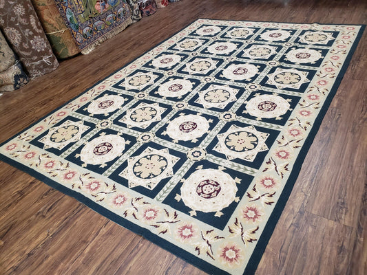 Vintage Needlepoint Rug 8x11, Floral Panel Design, Flatweave Handmade Needlepoint Carpet 8 x 11, Room Size Wool Needlepoint Rug, Cream Color