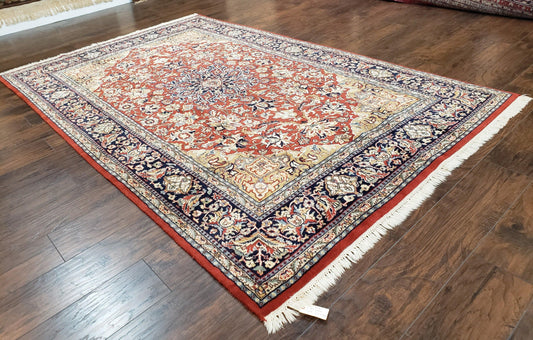 Vintage Indo Persian Oriental Rug 6 x 9.6, Wool Hand-Knotted Red Dark Blue & Gold Indian Carpet, 6 x 9 Office Room Rug, Floral Medallion