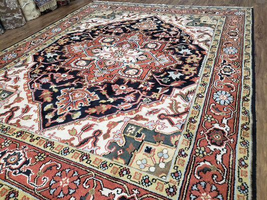 Vintage Indo Heriz Area Rug 8x10, Indo Persian Carpet 8 x 10, Red Dark Blue & Beige/Cream Indian Rug, Decorative Pattern, Wool, Hand-Knotted