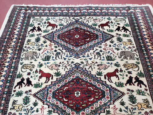 Vintage Indo Persian Area Rug 4.7 x 7.6, Wool Hand-Knotted Ivory Carpet, Animal Pictorials, Elephants Horses Lions, Indian Carpet, Unique