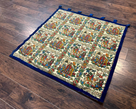 Vintage Chinese Pictorial Rug 2'4" x 4' 7", Chinese Village, Wool Hand-Knotted Blue & Teal Fine Carpet, Tapestry Rug, Woven Wall Art