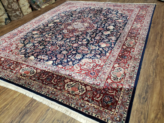 Vintage Dark Blue Persian Room Sized Rug 8x10, Wool & Silk Highlights Hand-Knotted Midnight Blue Red Floral Carpet, 8 x 10 Living Room Rug