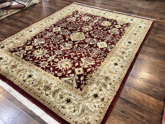 Vintage Indo Mahal Rug 8x10, Hand Knotted Wool Maroon & Beige Indian Agra Oriental Carpet, 8x10 ft Traditional Handmade Area Rug, Room Sized