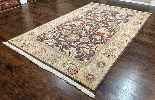Vintage Indo Mahal Area Rug 6x9, Indian Persian Oriental Carpet 6 x 9, Puce Eggplant Tan Beige Rug, Hand-Knotted, Large Floral Design Wool