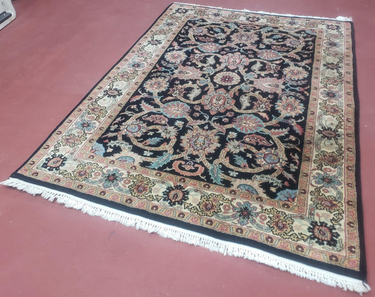 Vintage Indo Persian Mahal Area Rug 4x6, Wool Hand-Knotted Midnight Blue & Ivory Floral Design Indian Carpet, 4 x 6 Traditional Oriental Rug