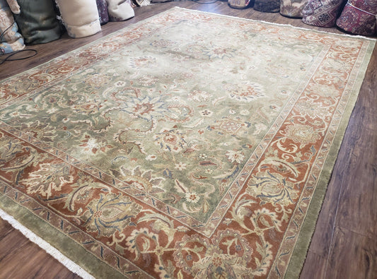 Vintage Indo Mahal Area Rug 9x12, Wool Hand-Knotted Laurel Green & Auburn Indian Carpet, 9 x 12 Floral Carpet, Living Room Rug
