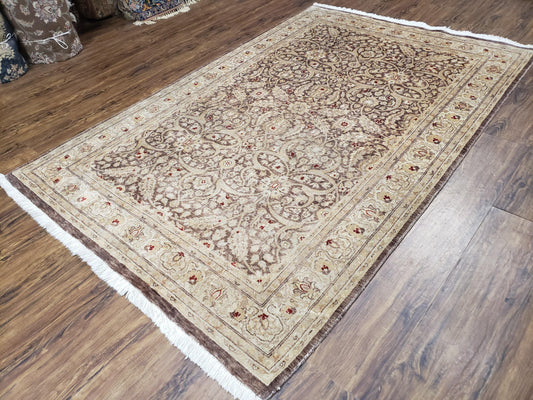 Vintage Persian Tabriz Rug 5x7, Beige and Green, Hand Knotted Handmade Wool Oriental Carpet 5 x 7 ft, Allover Pattern, Traditional Rug, Medium Size