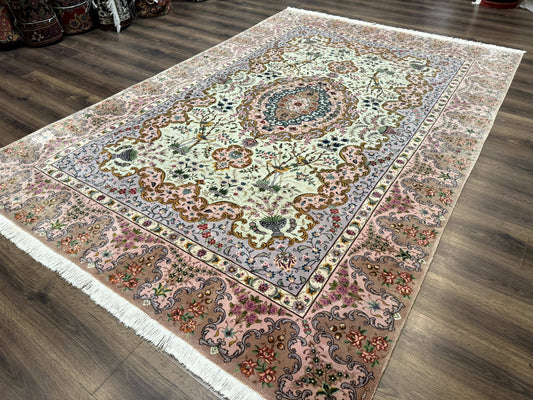 Wonderful Persian Tabriz Rug 7x10, Very Fine 330 KPSI, Light Green Light Blue Pink, Kork Wool Silk Foundation, Bird Pictorials