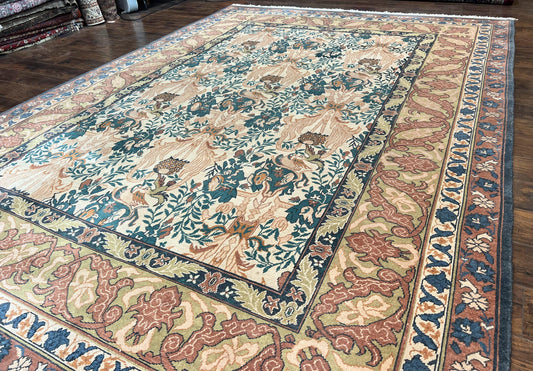 10x14 Hand Knotted Wool and Silk Traditional Tabriz 400 KPSI Oriental Area Rug Teal, Beige Color