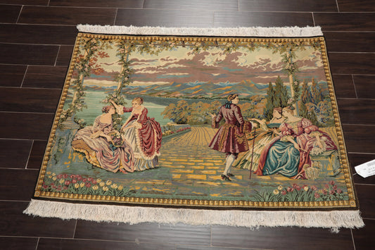 3' 2''x4' 10'' Hand Knotted 100% Wool French Tapestry Pictorial 300 kpsi Oriental Area Rug Beige, Black Color