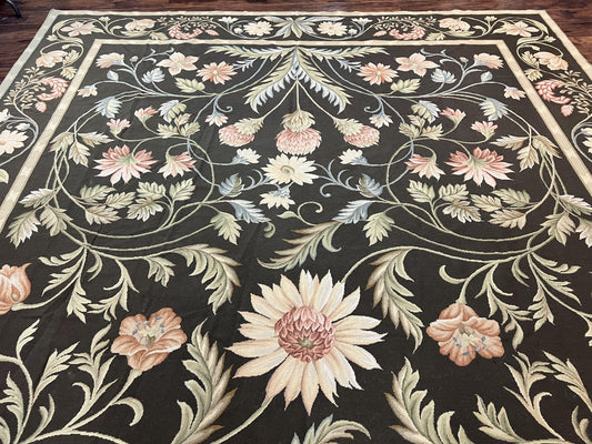 Large Needlepoint Rug 11x16, Dark Green Floral Elegant European Design Vintage Wool Handmade Carpet, Palace Size Rug