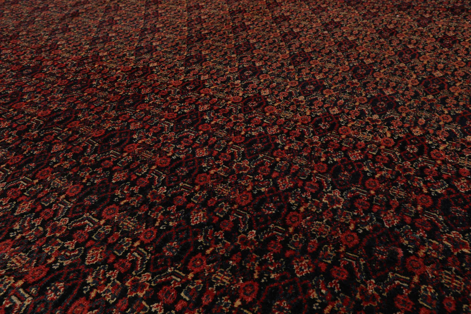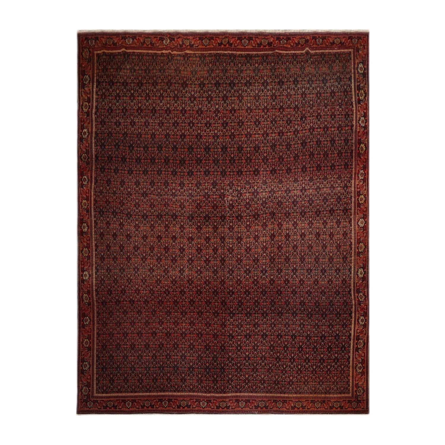 This is an authentic antique Senneh rug from Persia. Senneh rugs are renowned for their fine designs and distinctive weaving technique. Originating in western/northwestern Iran, they are made by Kurdish weavers and are exemplary for refined texture and originality. Senneh rugs are classified as village or nomad rugs. They are made not from a draft, but entirely from memory. This rug features an all-over pattern of repeating Herati motif in the inner field, encompassed by an intricately designed border. The overall impression is one of regality, sophistication, and unparalleled craftsmanship.