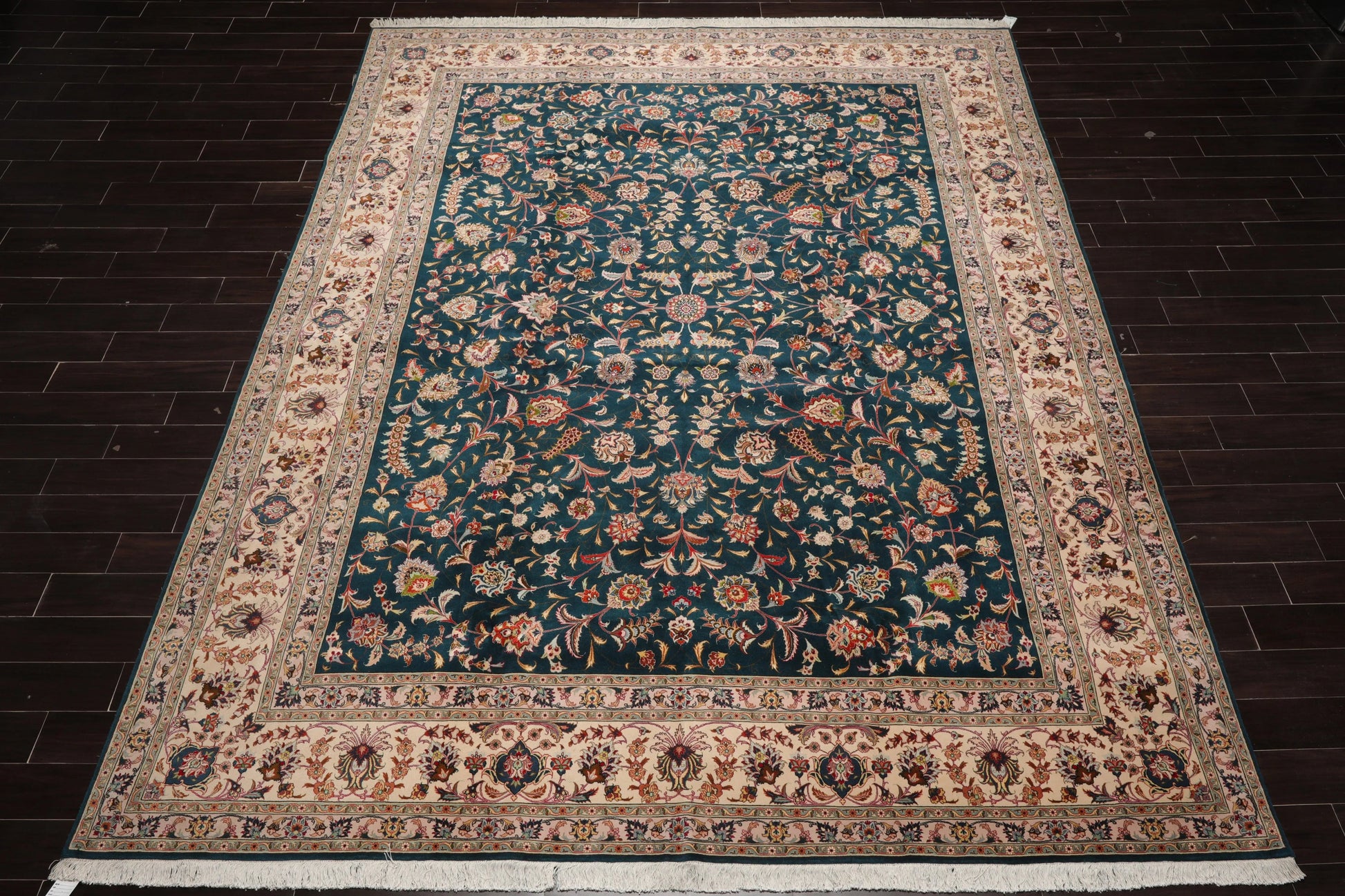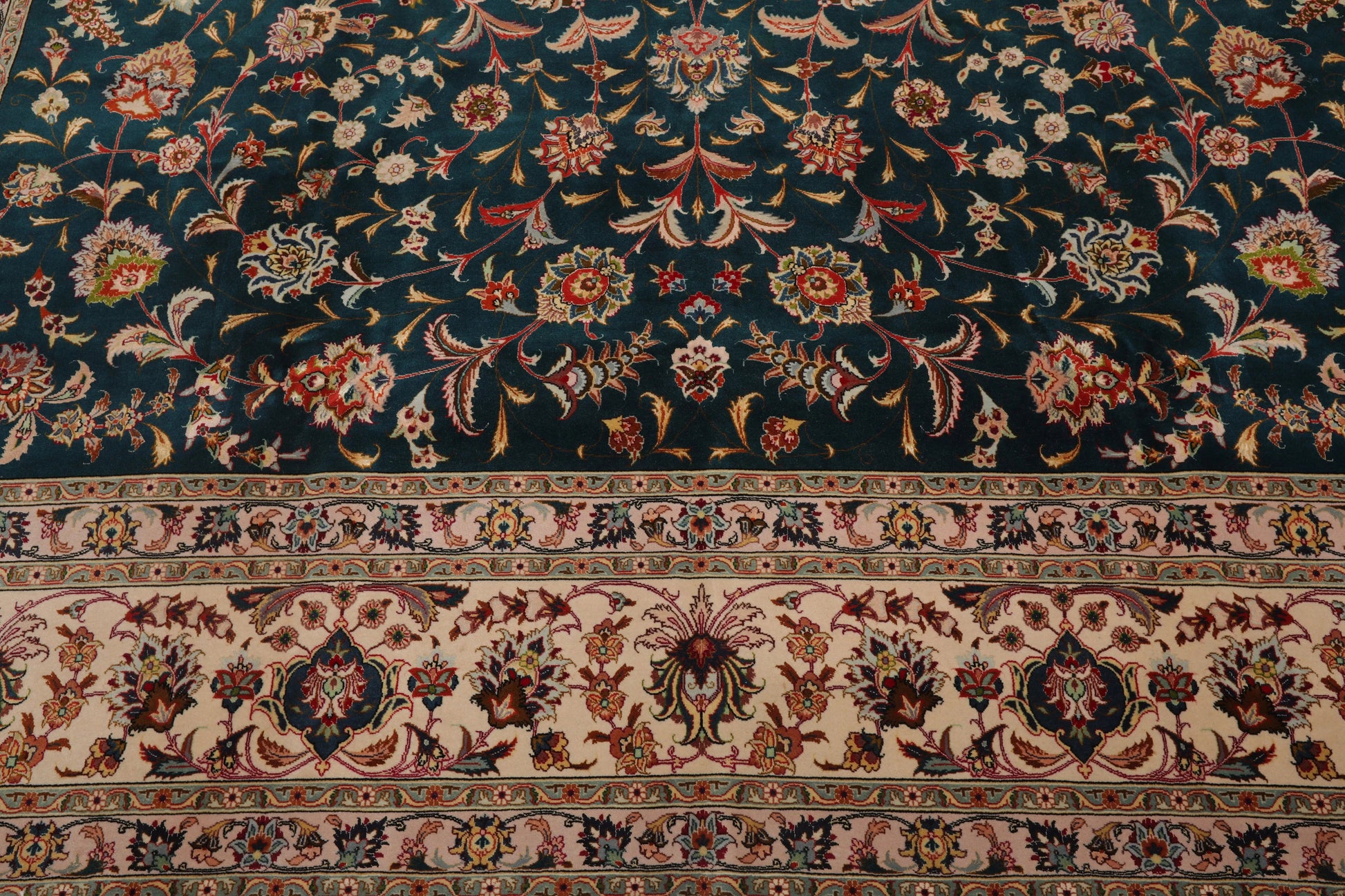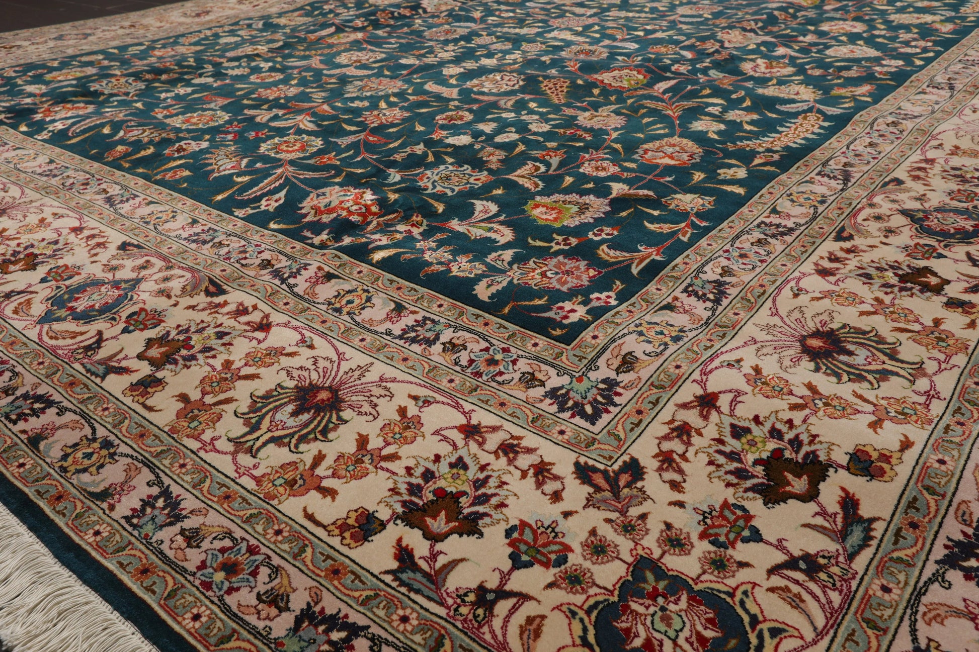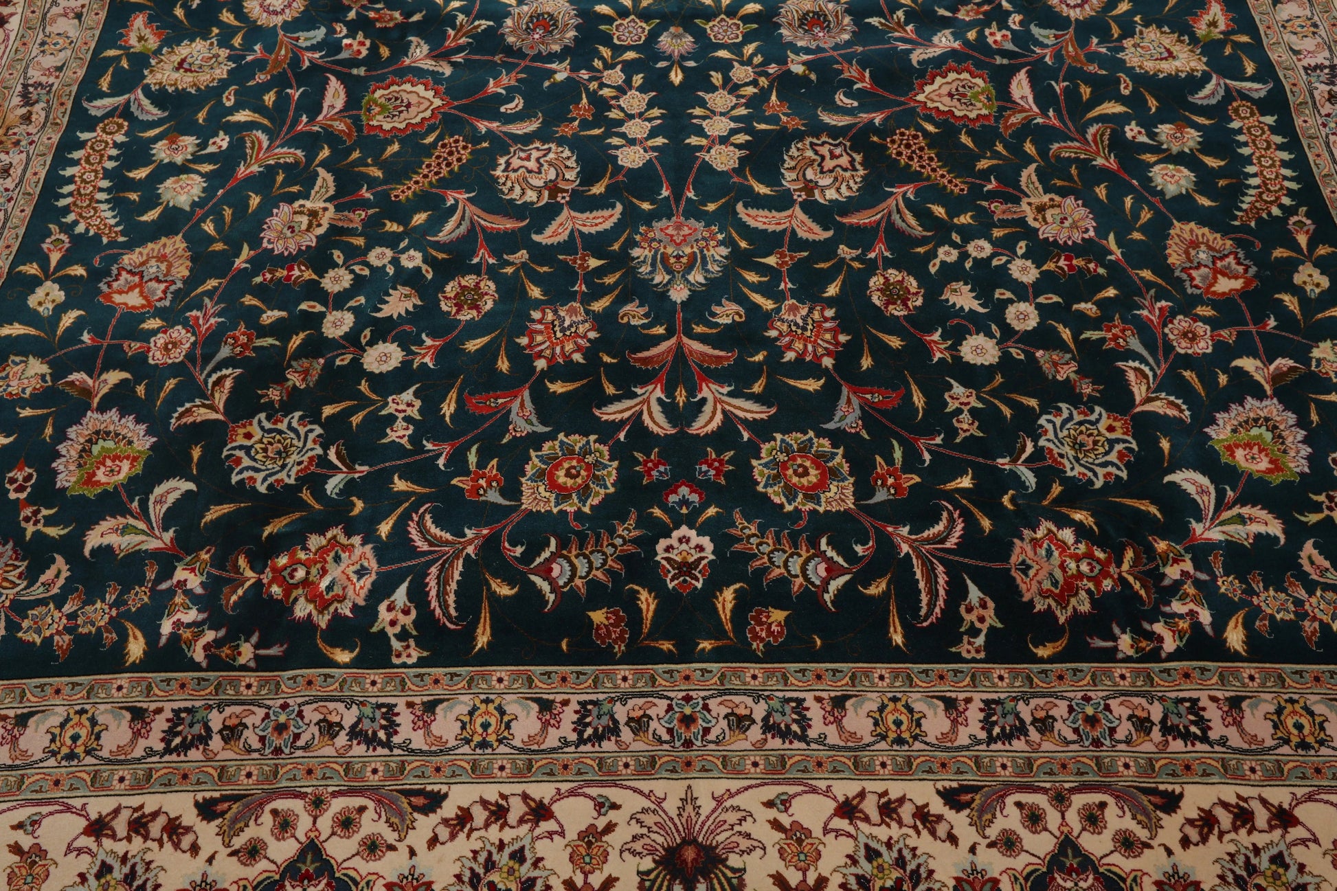 Heirloom quality! This rug represents the best in the tradition of artisanal rugs from the eponymous region of Iran. Hand knotted with high quality wool and silk, one knot at time with 400 knots per square inch, the rug reflects the time-honored weaving tradition of the region with high quality craftsmanship that have made Tabriz rugs so popular across the ages. An heirloom you can bequeath to your posterity. The rug features arabesque scrolls and flower motifs on a rich teal inner field hemmed by handsome beige/taupe border. The overall impression is one of regality, sophistication, and unparalleled craftsmanship.