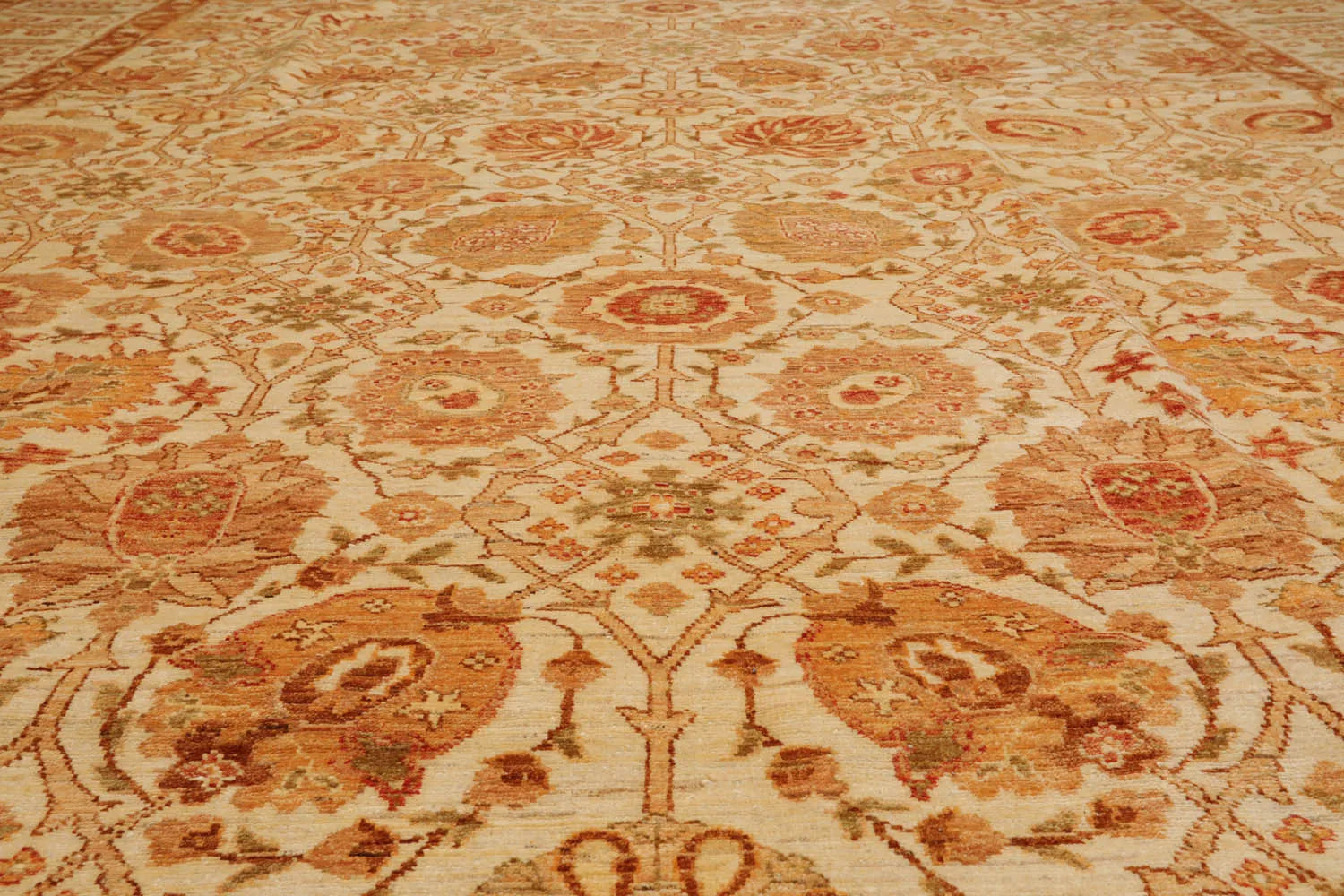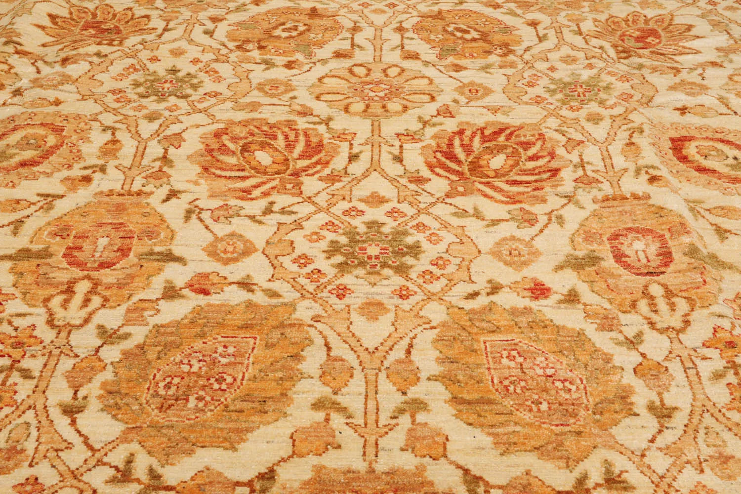 Story Behind the Art: Hand-knotted rugs are Pakistan's second-largest cottage and small industry that began as early as the 11th century under the Mughal rule. The craftsmen have the capacity to produce any type of rug using all the popular motifs of guls, medallions, paisleys (botehs), traceries, and geometric designs in various combinations. While the "stone washes" are used to fade and soften colors, the Peshawar style is characterized by a thinly sheered pile, large print designs, and most predominantly, their antique ivory and sometimes golden tones.