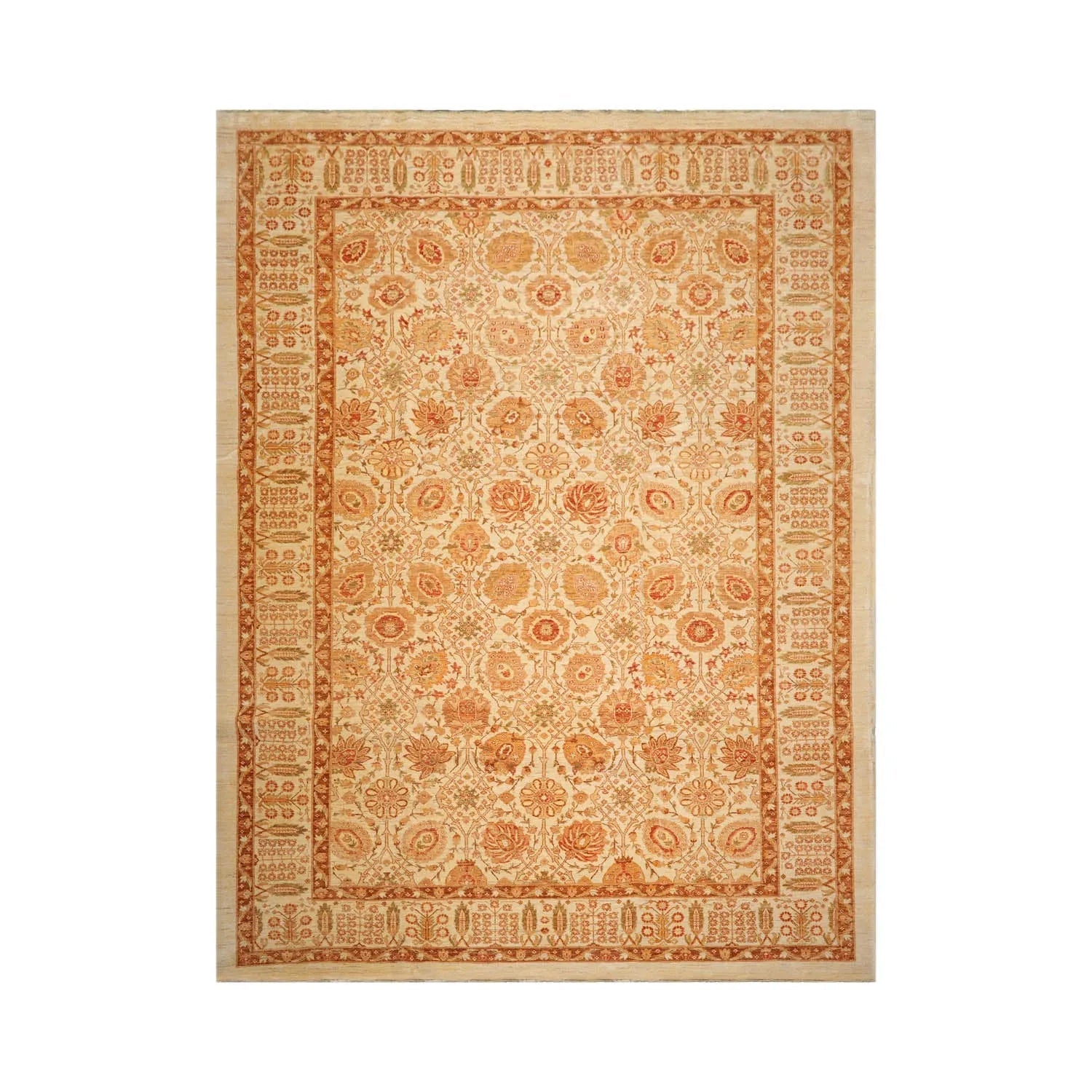 This is a beautiful Ivory, Brown, Rust, Green, Peach, Multi Hand Knotted Wool Peshawar rug from Pakistan. Peshawar The main field comprising highly stylized floral and botanical elements is encompassed by a handsome multi-band border with a bold pattern in the main border. The design of the border complements the inner field and adds gentle grandeur to the artful composition of the rug. Peshawar rugs are known for their thinly sheared pile, large designs and antique finish look. Made with high quality wool and natural dyes, the rug features a high sheen pile and Persian botanical motifs in a versatile color palette that suits different decor styles.