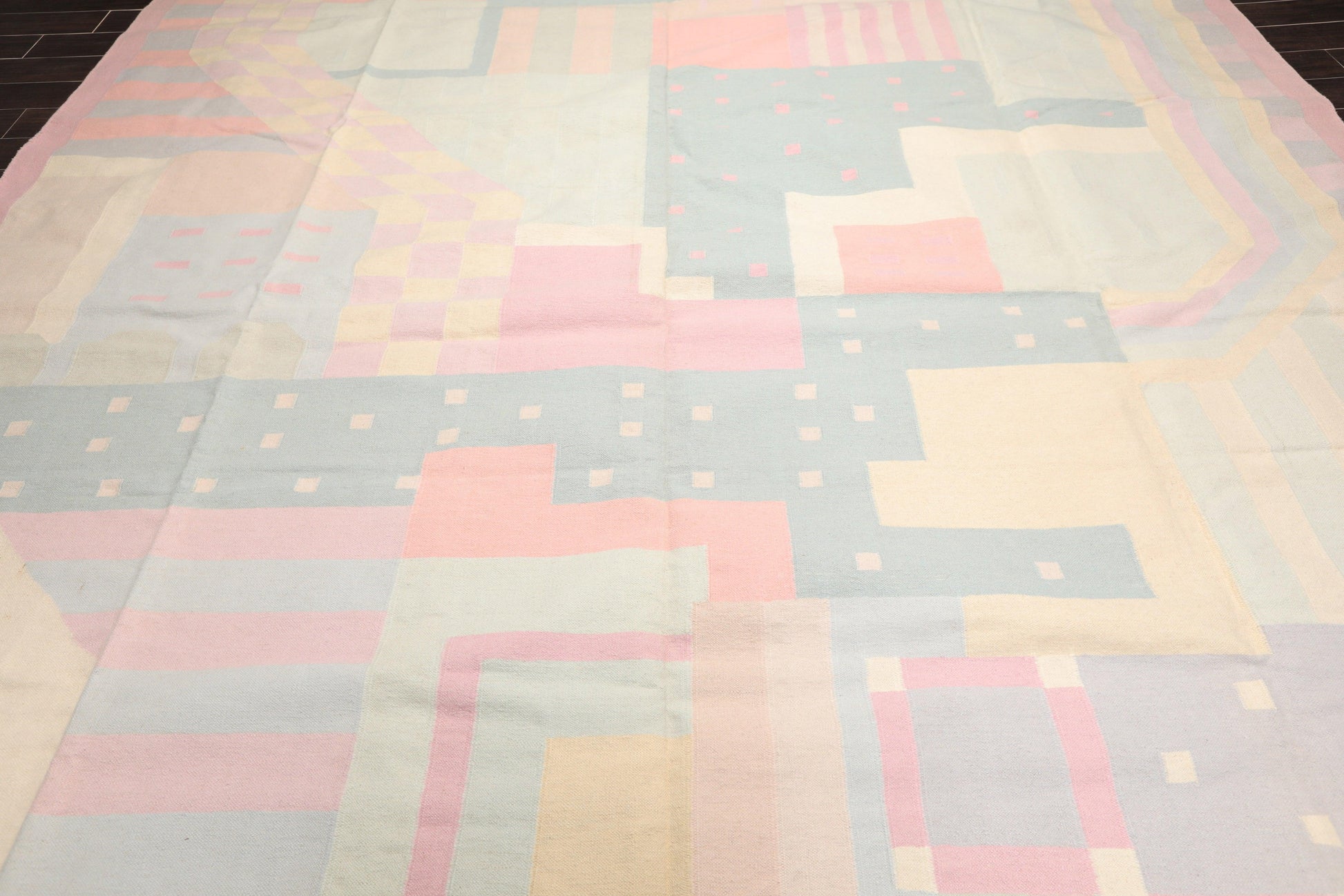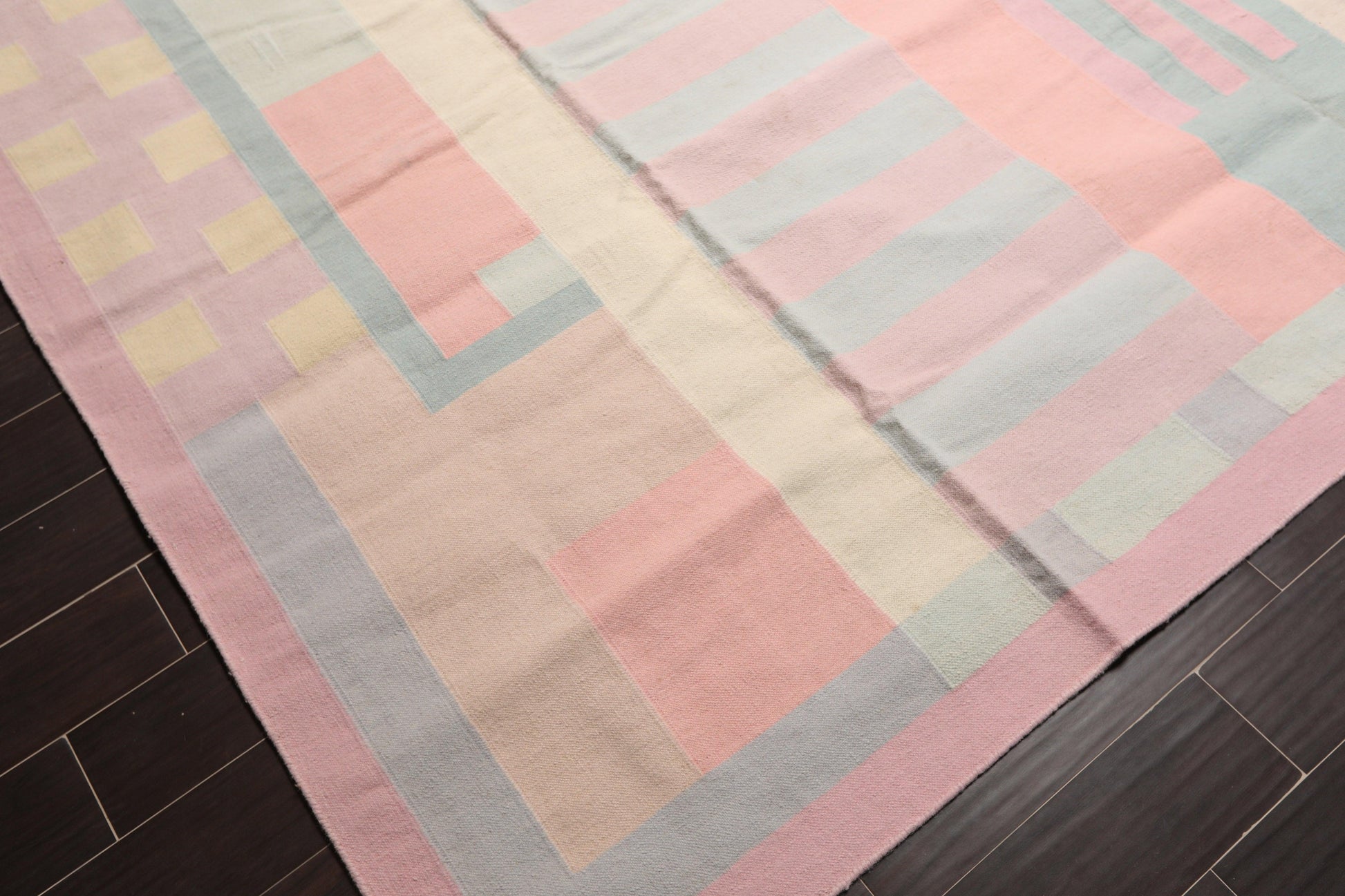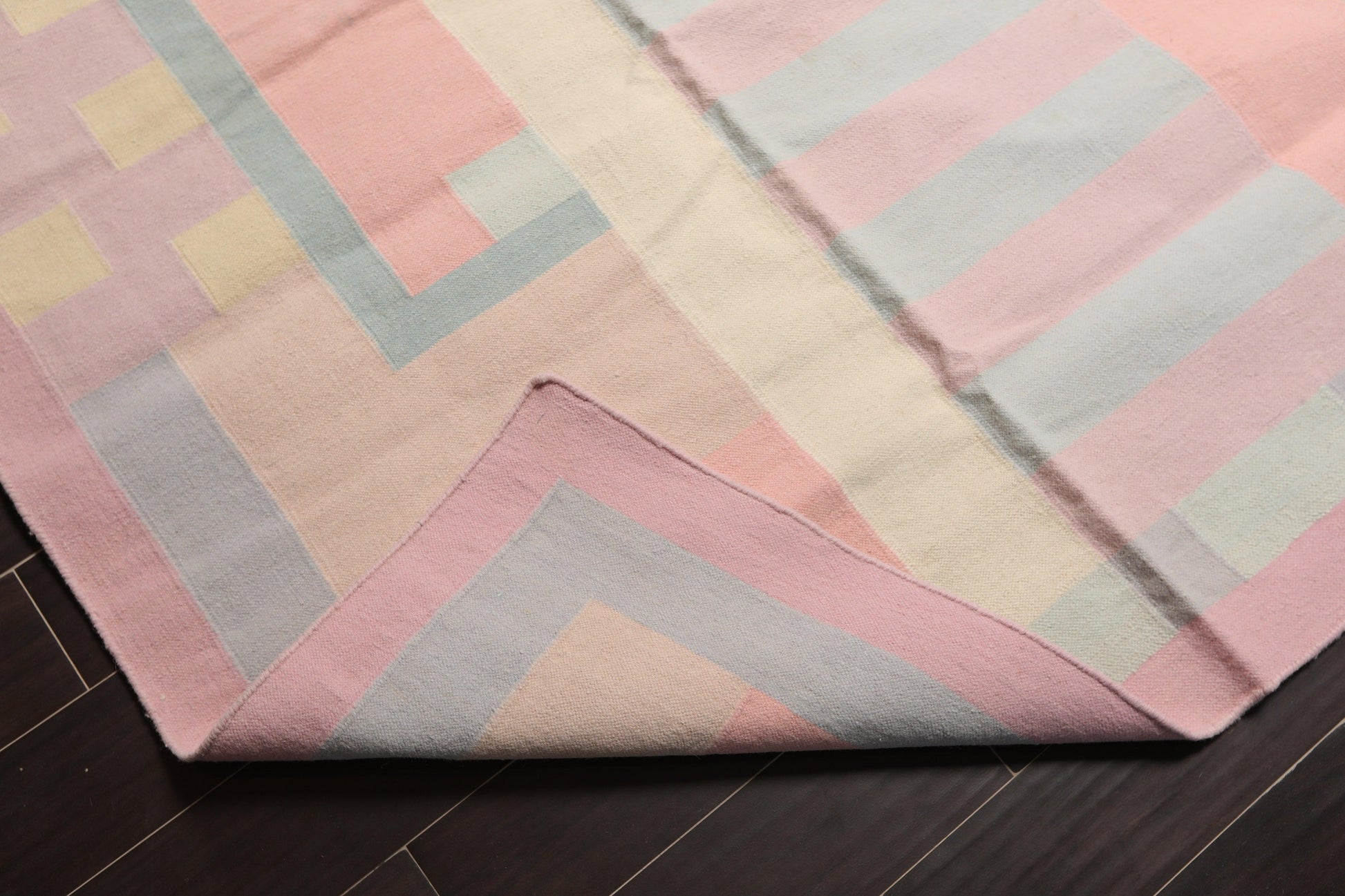 This is a beautiful Baby Pink, Baby Blue, Vanilla, Aqua, Green, Multi Color Reversible Dhurry Hand Woven Persian Oriental Area Rug Wool Rug. Its elegant style is easy to decorate with and perfect for living room, dining room, bed room or anywhere in the residence or office.
