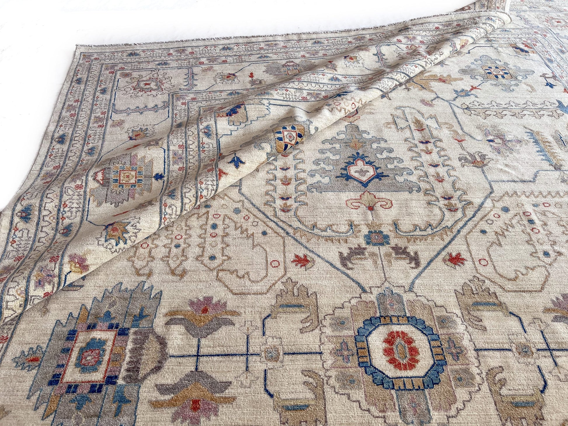 This Afghan-made rug draws inspiration from the timeless elegance of antique Turkish Oushak designs, reimagined with authentic craftsmanship. Hand-knotted from hand-spun Ghazni wool dyed with natural vegetable pigments, each piece reflects the skill of traditional weavers. The ivory palette offers versatile sophistication, complementing diverse interiors while the substantial 10x14 dimensions anchor larger spaces with presence and warmth. Exported from Pakistan, this rug combines heritage techniques with contemporary availability, delivering the character of a collector's piece at an accessible price point.