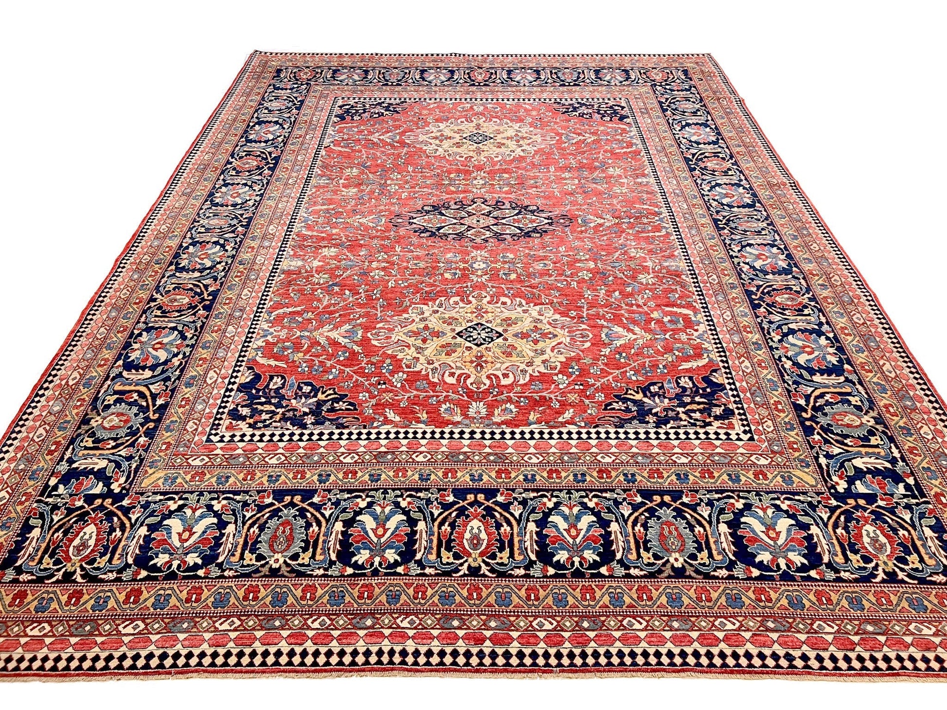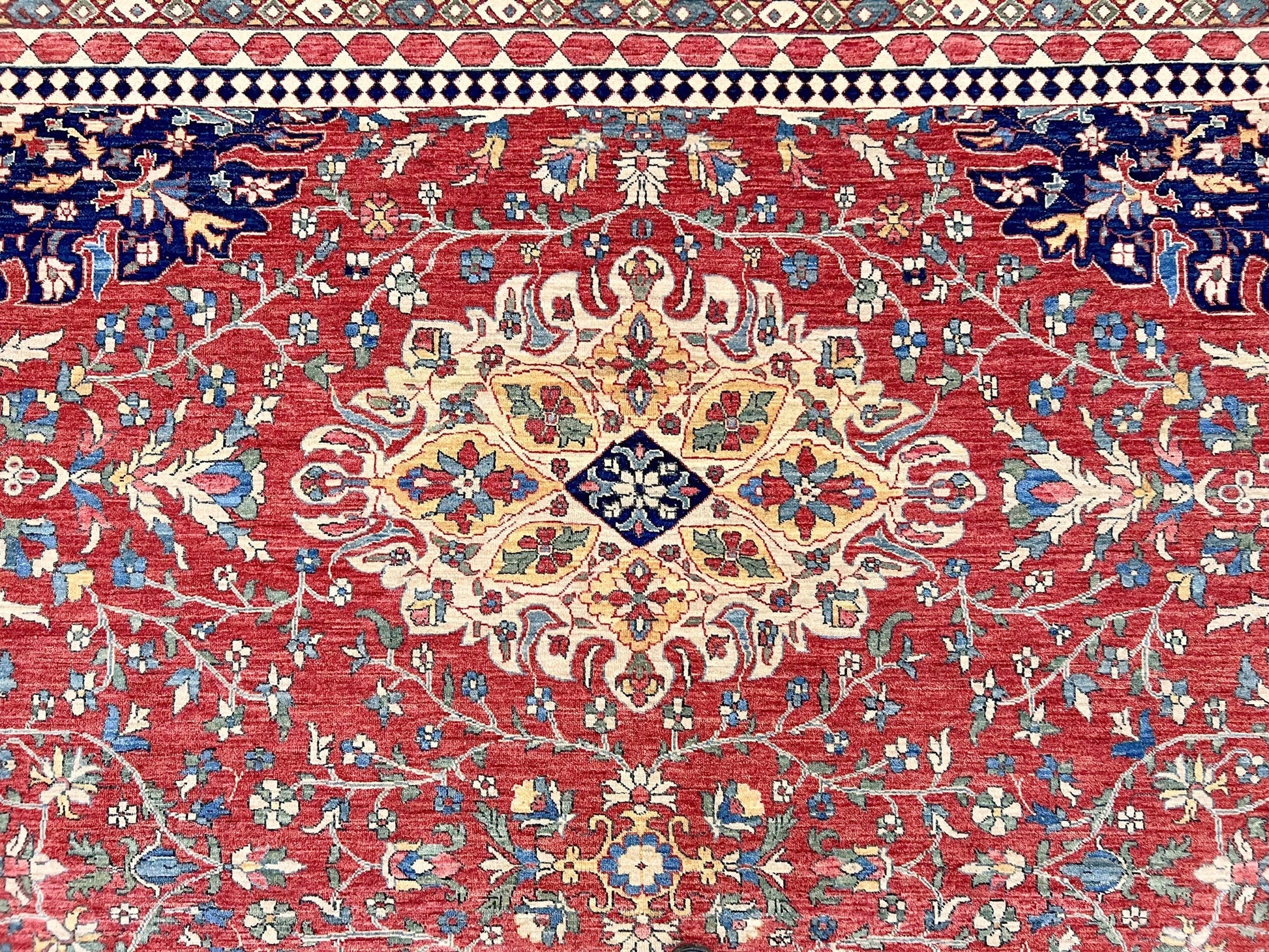 Fine Afghan weaving of an antique Persian Sarouk design – hand-knotted of hand-spun, vegetable-dyed Ghazni wool – antique-washed and exported from Afghanistan