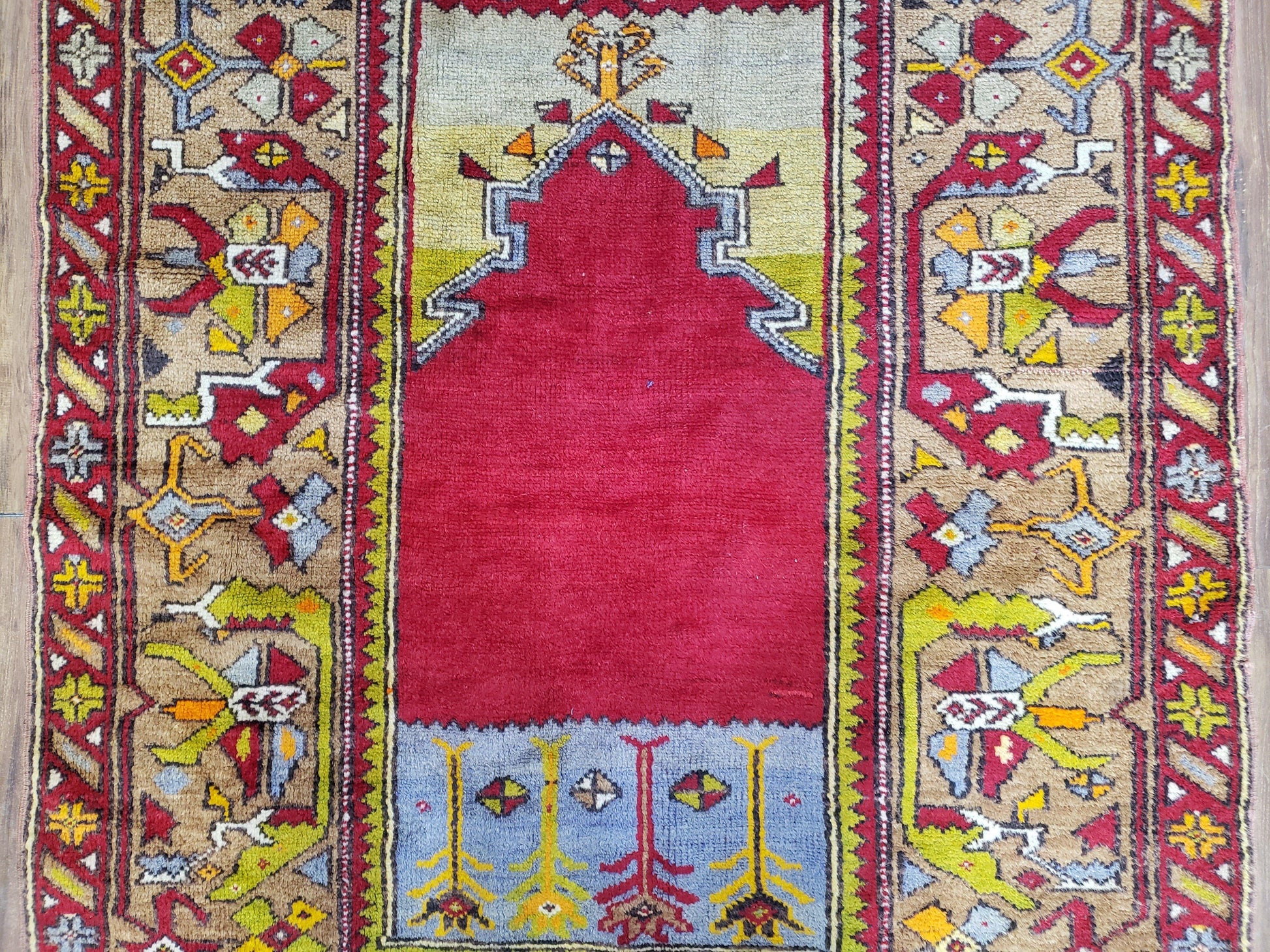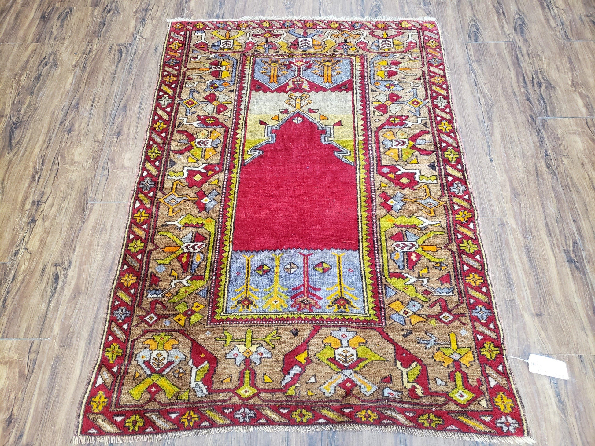Antique Turkish Prayer Rug 3.8 x 5ft, Colorful Prayer Rug, Red Blue Gold Multicolor Turkish Anatolian Carpet, Handmade Hand-Knotted, Wool