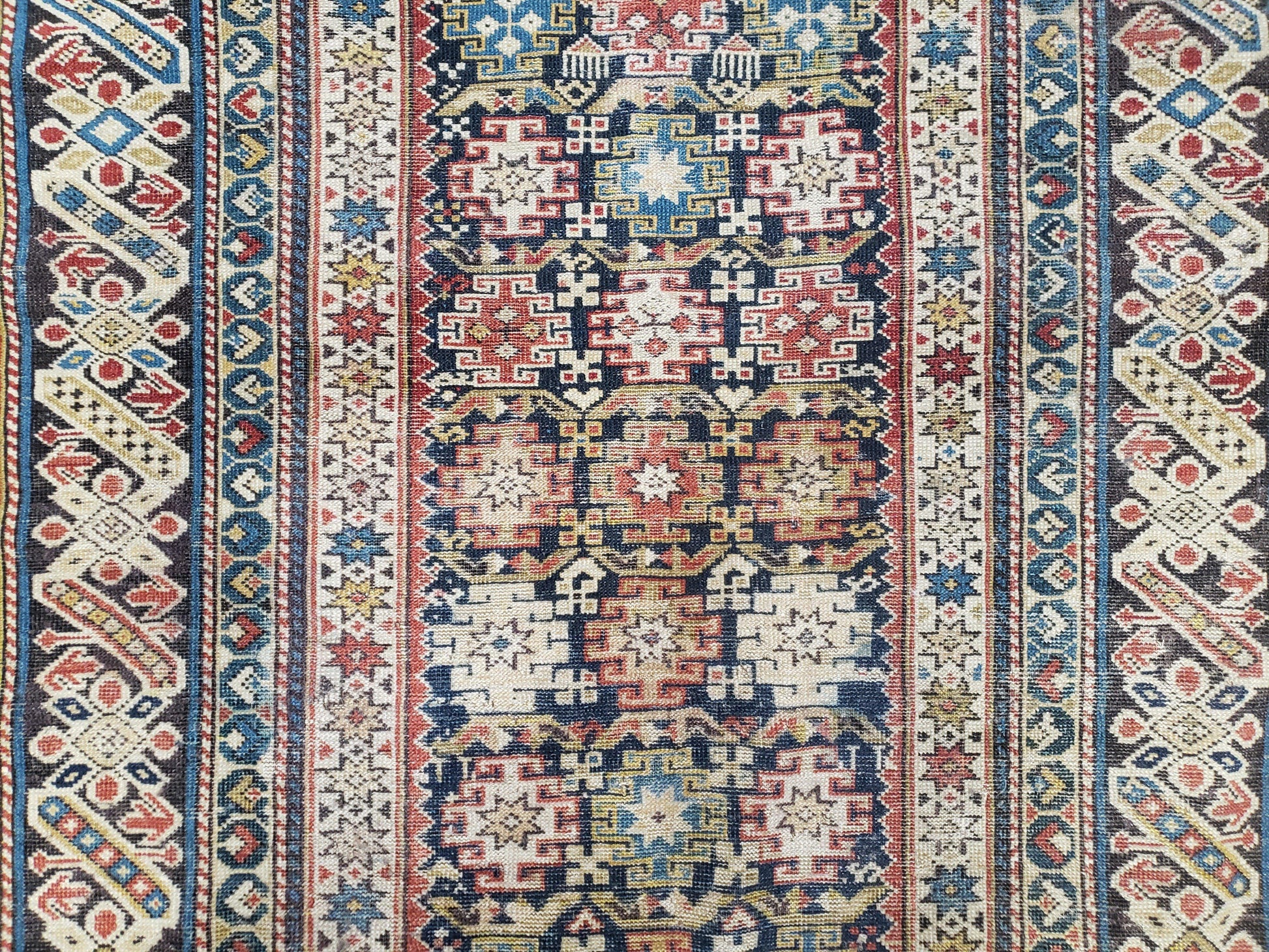 Caucasian Rug 3'9" x 5'7", Antique 1920s Collectible Caucasian Chi Chi Carpet, Hand Knotted, Colorful, Dark Blue Cream Red, Wool, Small Rug