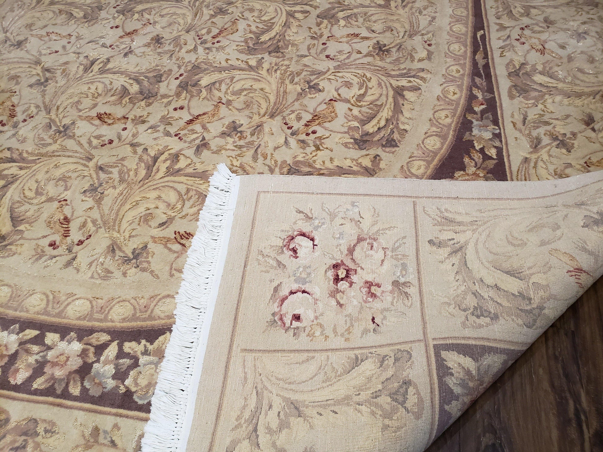 Chinese Aubusson Savonnerie Area Rug 8x12, Vintage 120 Line Carpet, Wool and Silk Hand-Knotted, Birds Flowers Master Weaver Signature