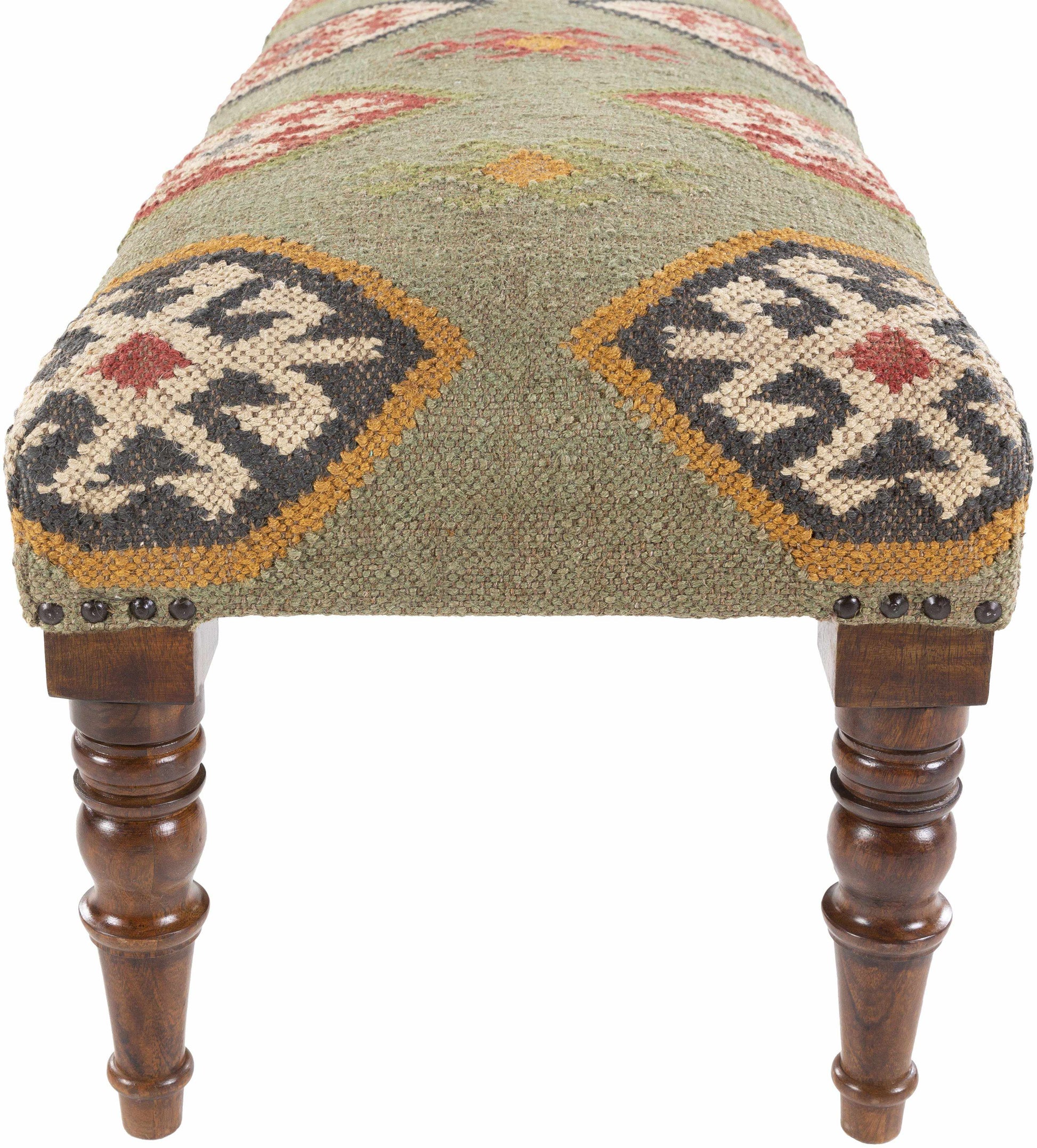 The deep green backdrop is complemented by earthy tones of mustard, red, and beige, creating a harmonious mix that feels both cozy and sophisticated. These colors are versatile enough to blend seamlessly with rustic, bohemian, or traditional interiors, making the bench a design chameleon for your home.