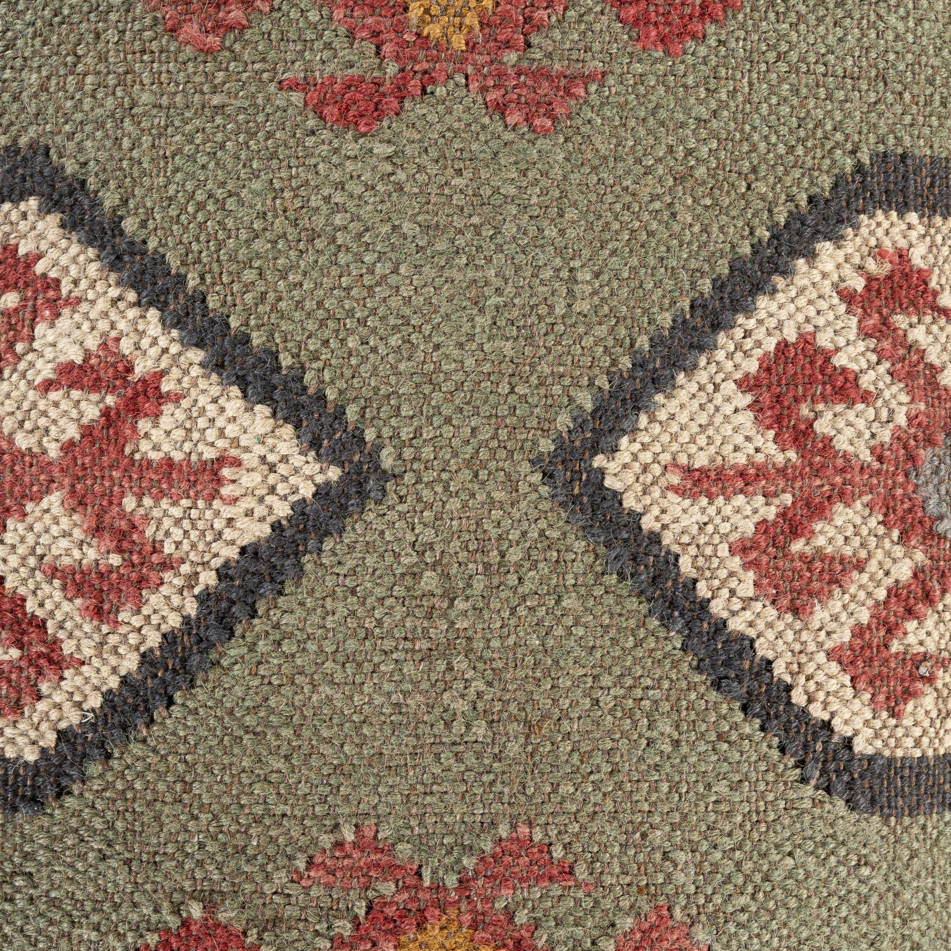 Colors: Dark green base with dark red, beige, mustard, charcoal, sage, and grass green accents