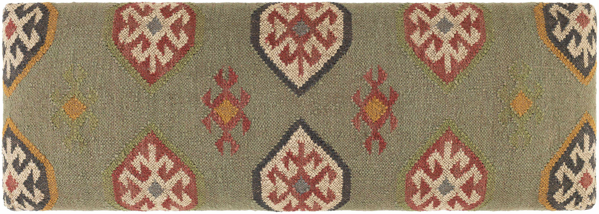 Elevate your home décor with the Gran Dark Green Bench, a handcrafted masterpiece that blends rustic charm with timeless elegance. Featuring a rich color palette of dark green, dark red, beige, mustard, charcoal, sage, and grass green, this bench adds warmth and character to any room. Meticulously handwoven in India from premium jute and wool with sturdy wooden legs, it offers both durability and artistry in one versatile piece.