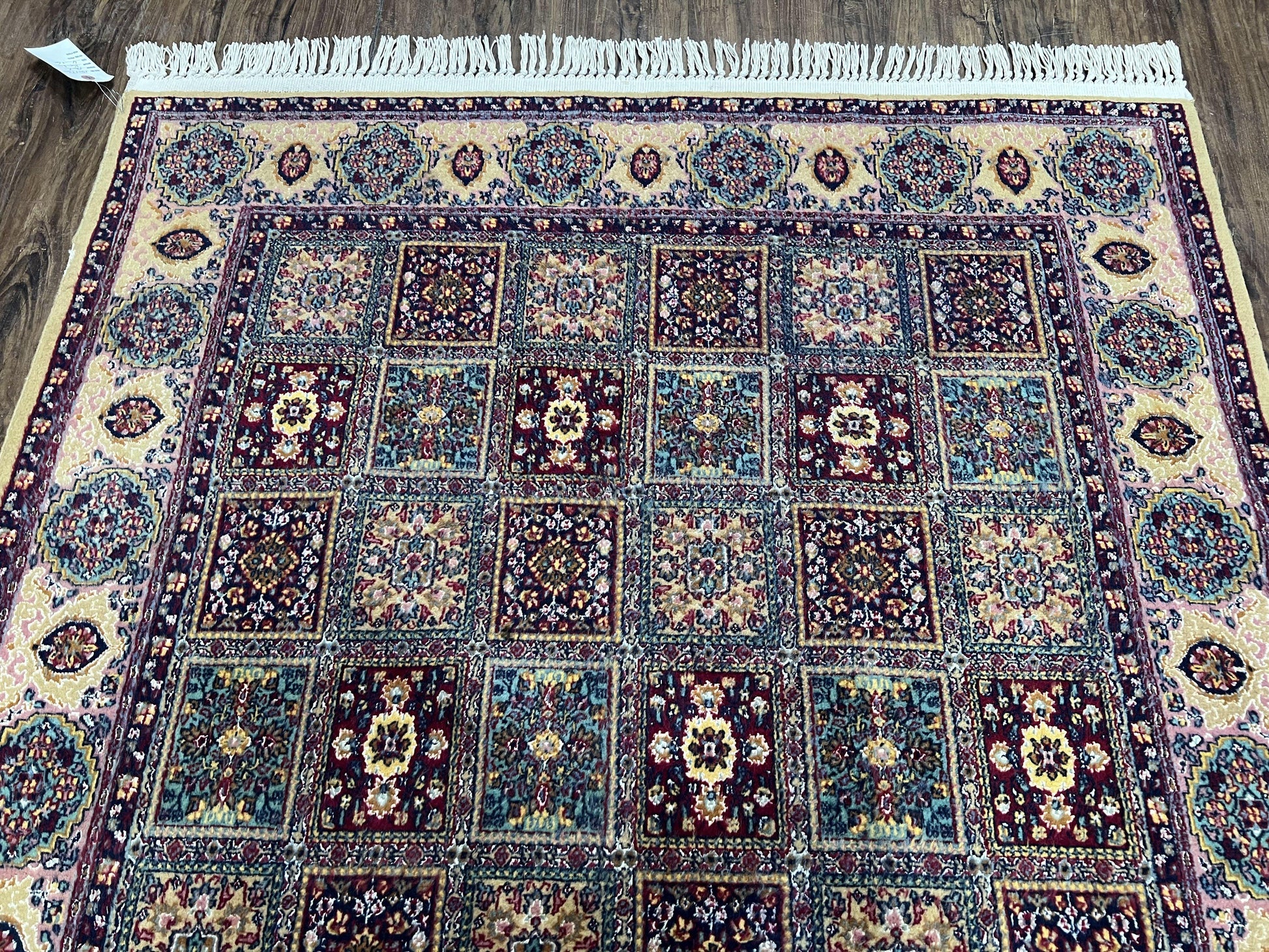 Indo Persian Silk Rug 4x6, Panel Design, Small Flowers, Hand Knotted, Fine Weave, Oriental Carpet 4 x 6, Vintage Area Rug, Beautiful Rug
