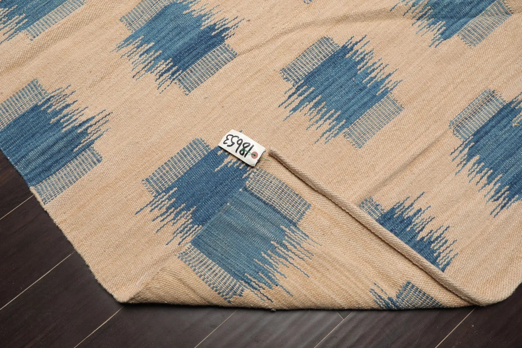 Enhance your home interiors with a handwoven flatweave rug from India, showcasing a modern Ikat pattern that adds texture and glamor. This remarkable rug is a prize for its reasonable price.