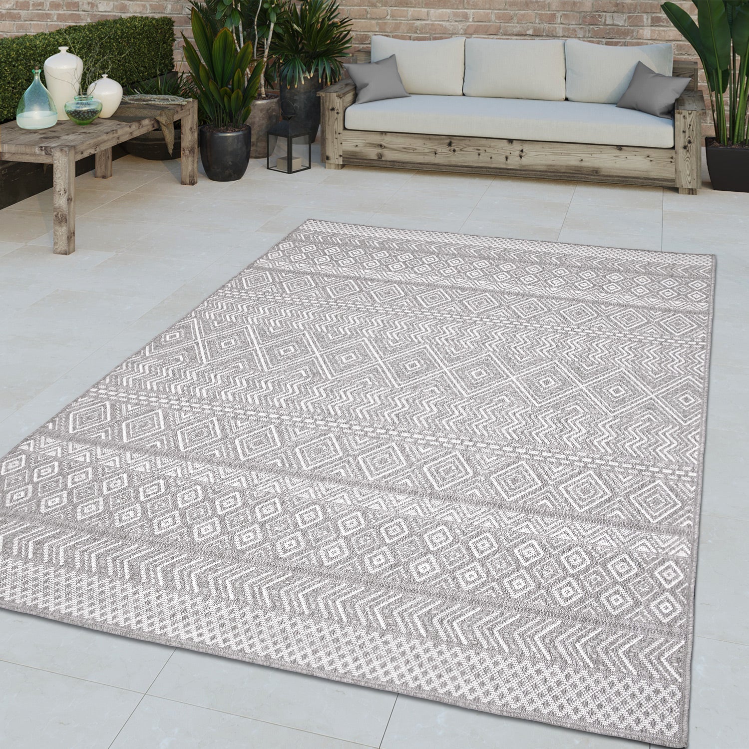 Outdoor Rug Vermont Stain-Resistant with Boho Pattern in Grey