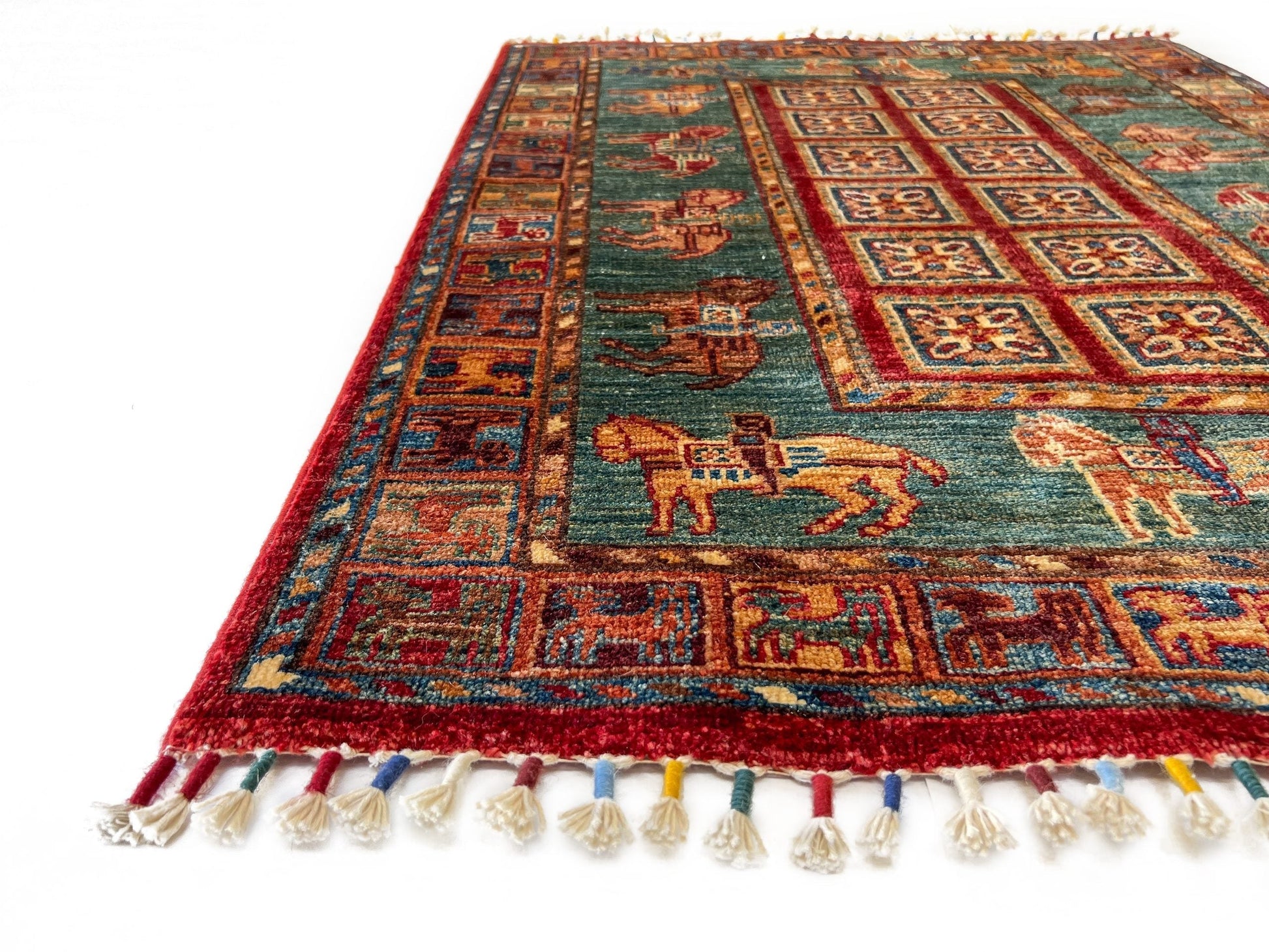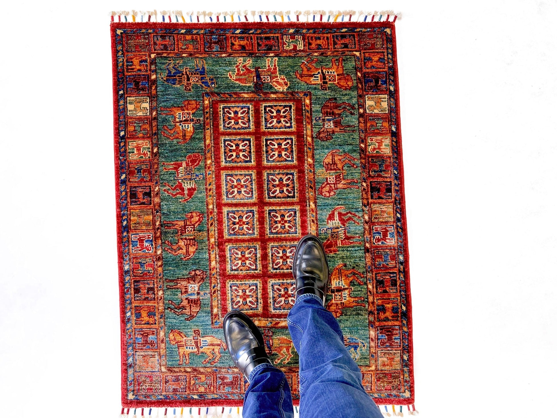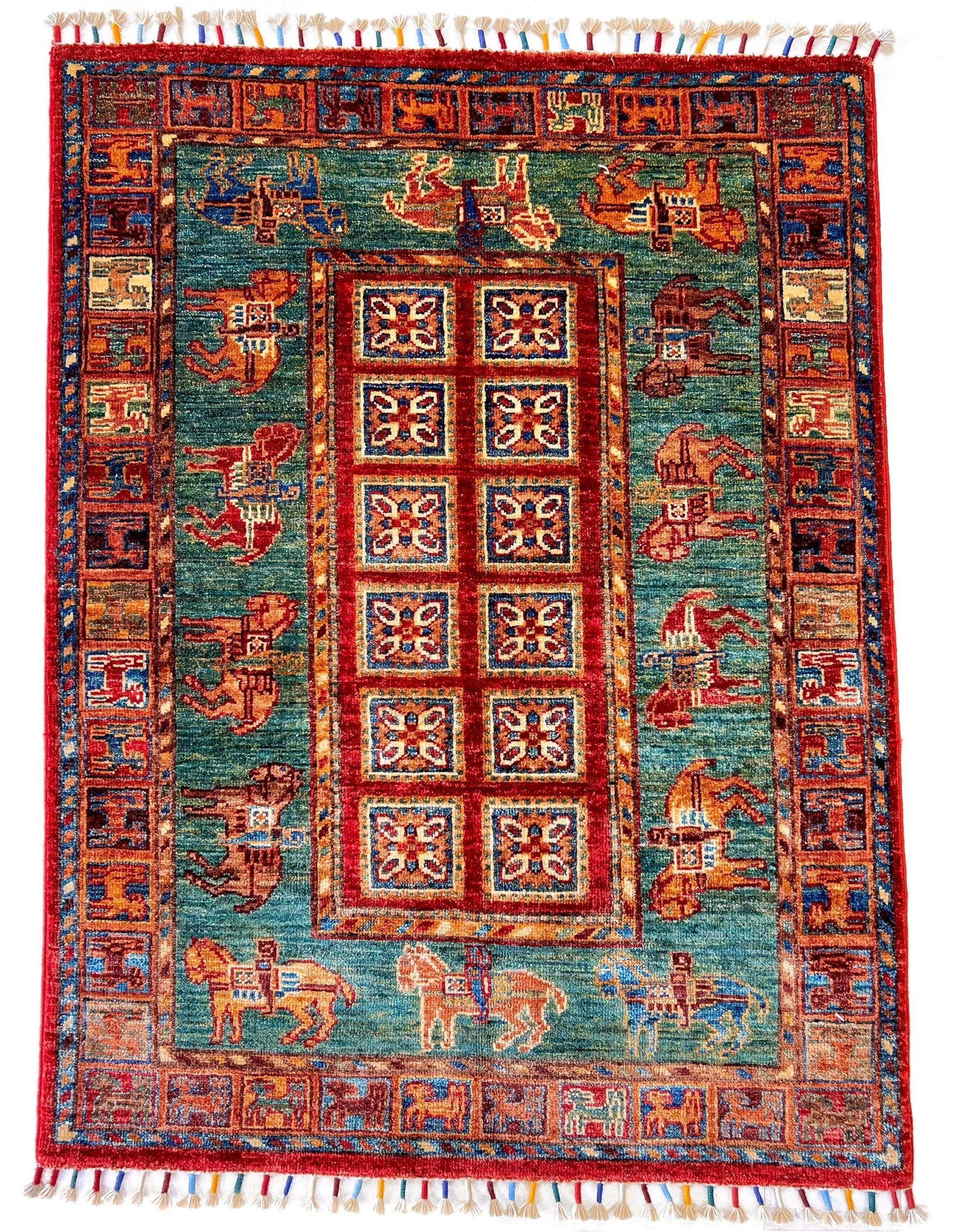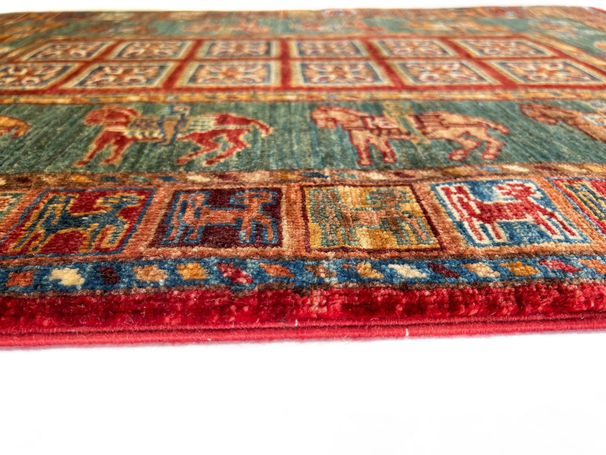 Afghan-made Pazyryk design – an ancient design recreated in Afghanistan – hand-knotted of hand-spun, vegetable-dyed Ghazni wool in Afghanistan; exported from Pakistan