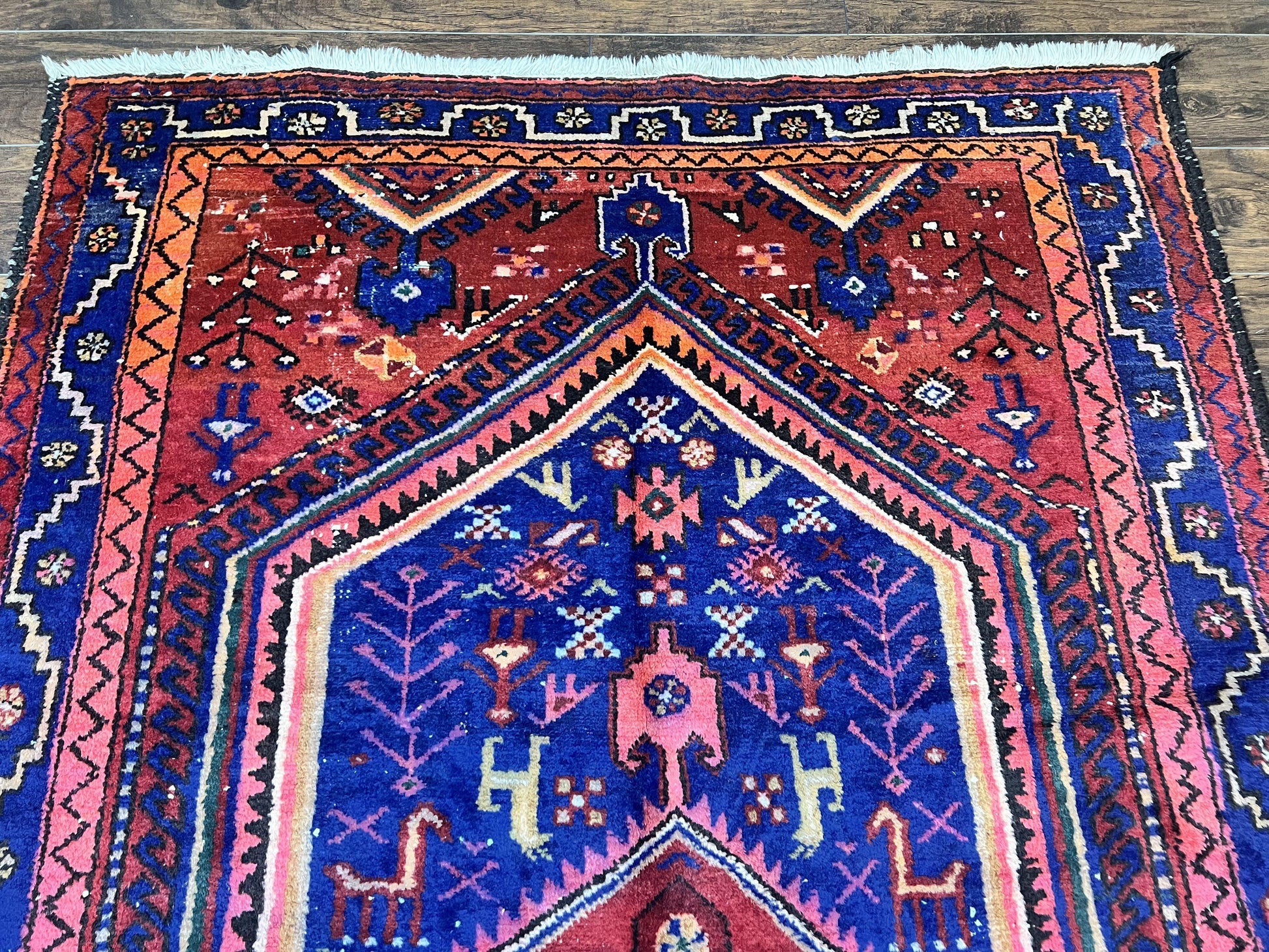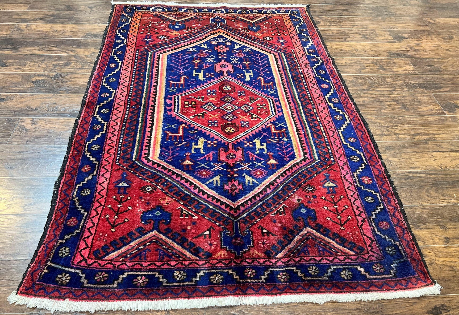 Persian Tribal Rug 5x7, Wool Handmade Vintage Hamadan Nahavand Carpet, Red & Navy Blue, Animal Motifs, Geometric Oriental Rug 5 x 7