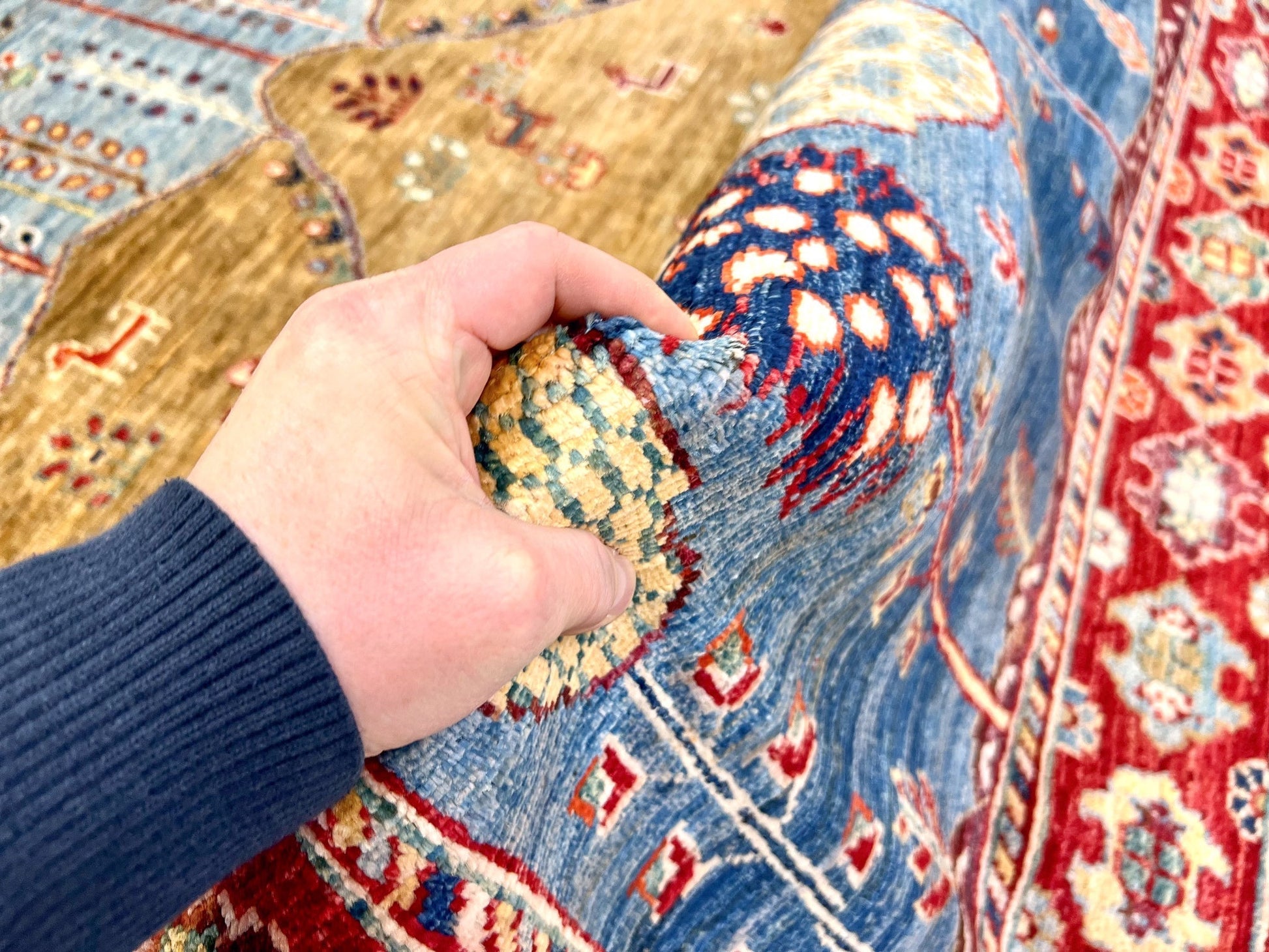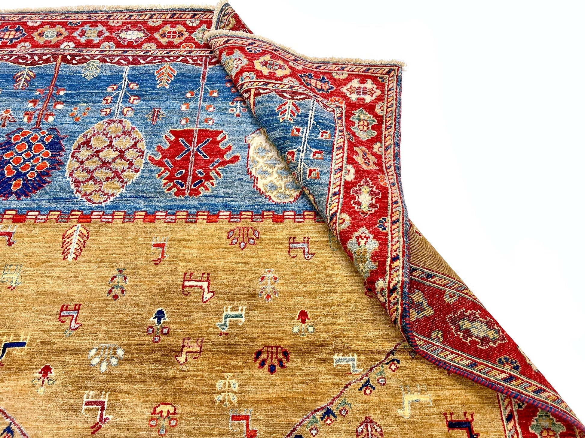 Scenic agricultural Tree of Life landscape design featuring cypress & pomegranate trees – hand-knotted of hand-spun, vegetable-dyed Ghazni wool in Afghanistan – luster-washed and exported from Pakistan