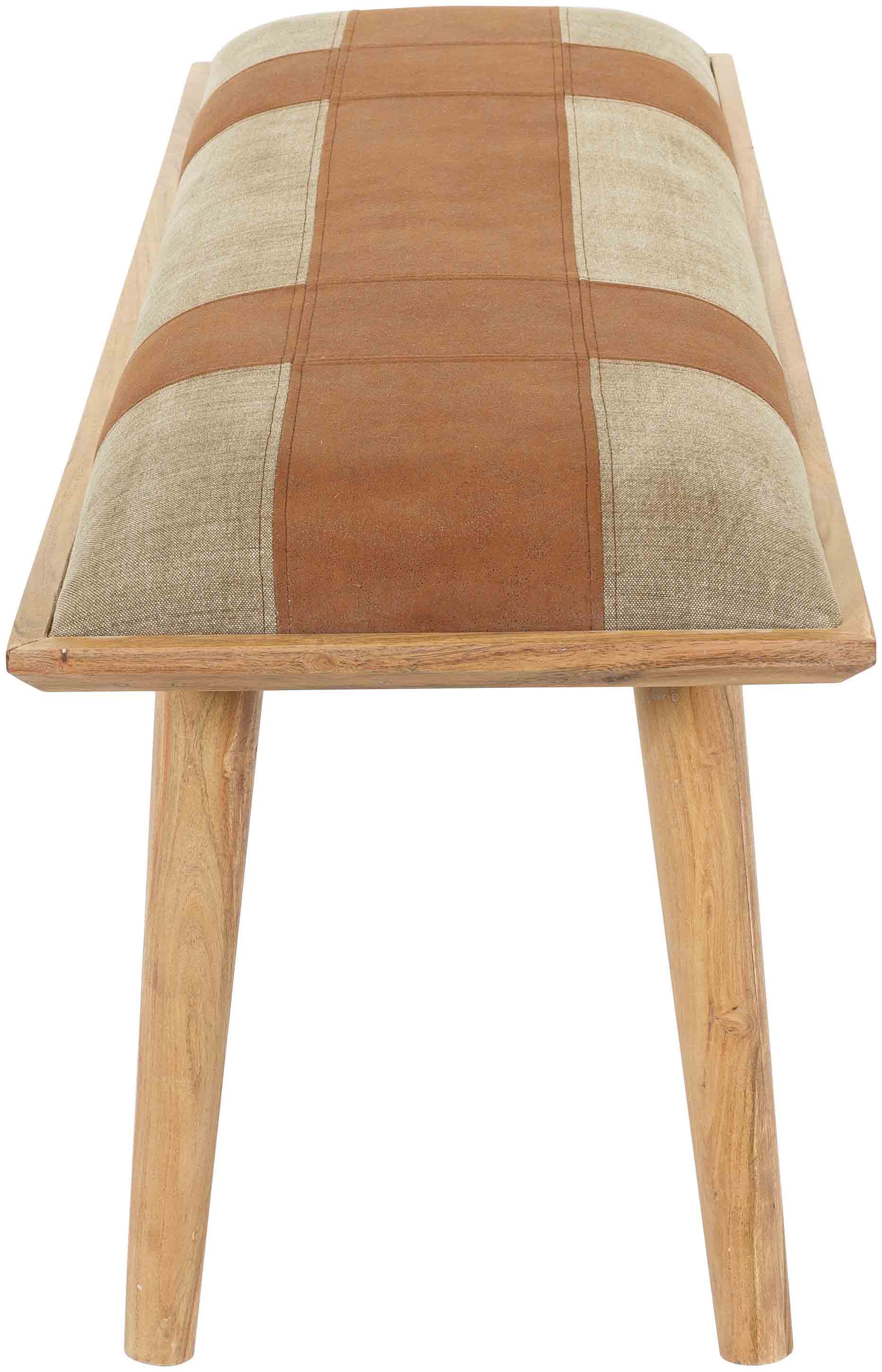 Wrapped in a soft cotton blend and faux leather upholstery, the seat is padded for extra comfort, making it an ideal perch for putting on shoes, serving guests, or simply styling your favorite throw blanket. The contrast between the warm brown tones and solid wood legs adds visual depth while keeping things natural and neutral.