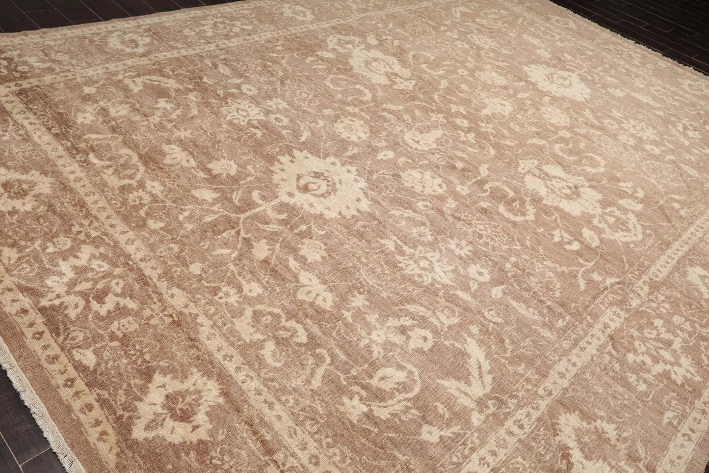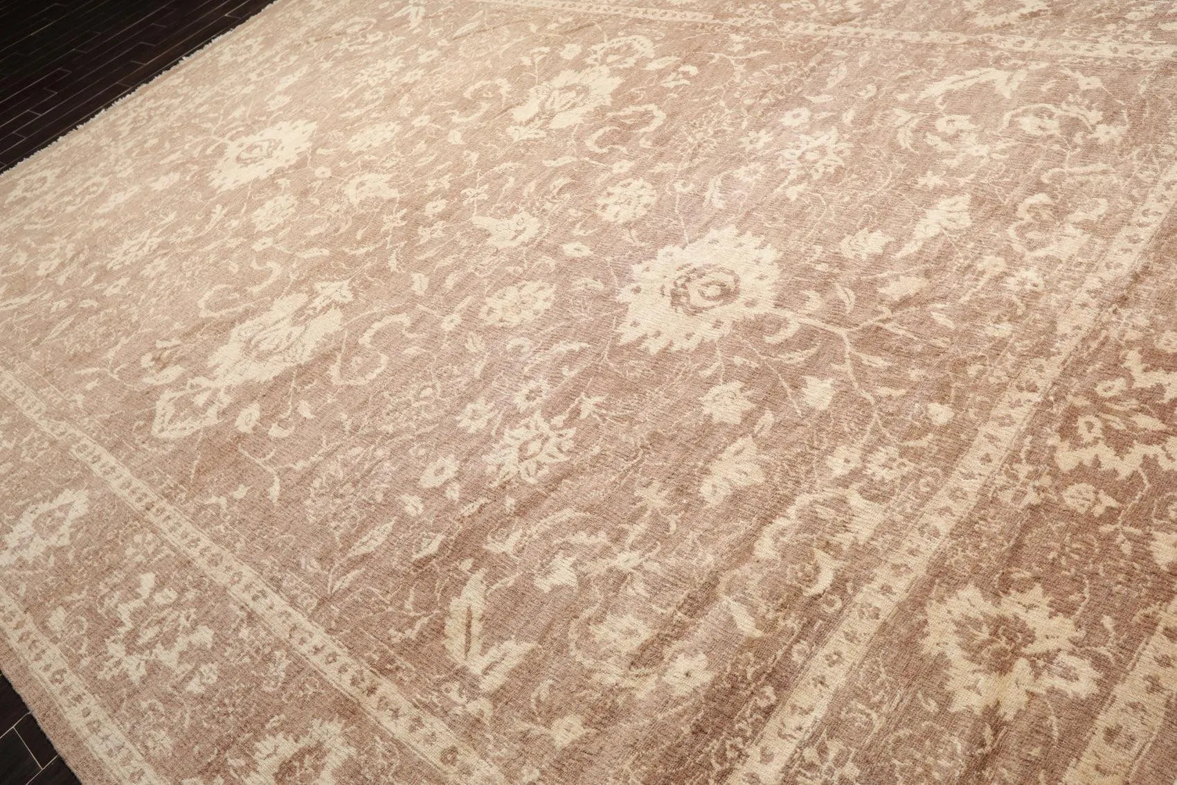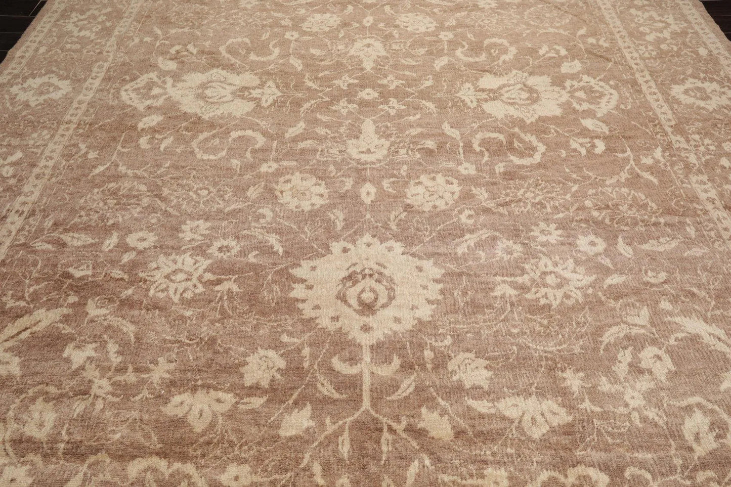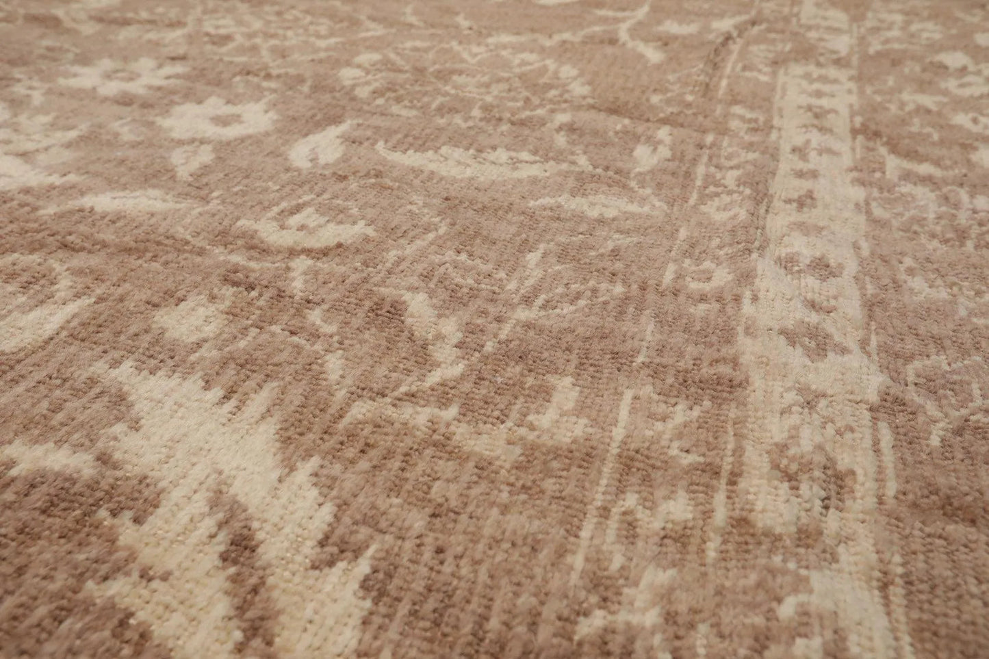 This 10’x14’ hand knotted rug fuses the magic of timeless traditional designs with the spirit of modern times. Made from lanolin rich wool, the rug uses Turkish knots for enduring durability and features a hand clipped extra thin pile. A special wash system has been used to give the rug a unique antique finish patina and a high velvety sheen. Essentially a reproduction, the rug has erased pattern that imparts it an edgy modern and contemporary look and is versatile to suit different styles of home décor.