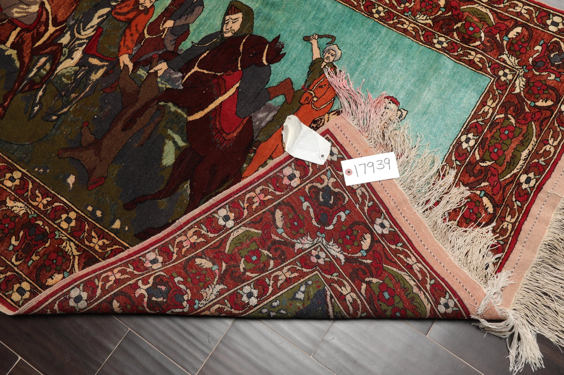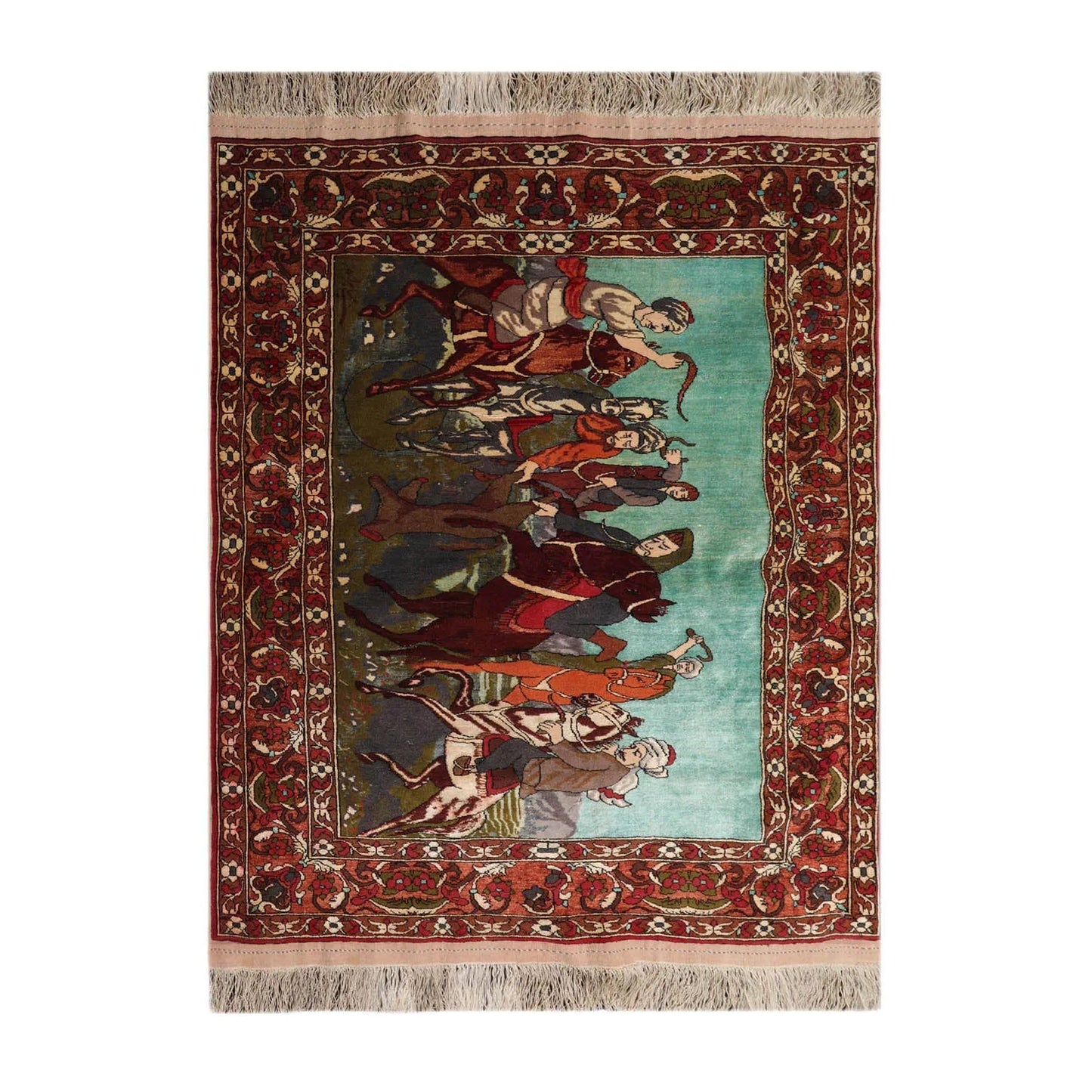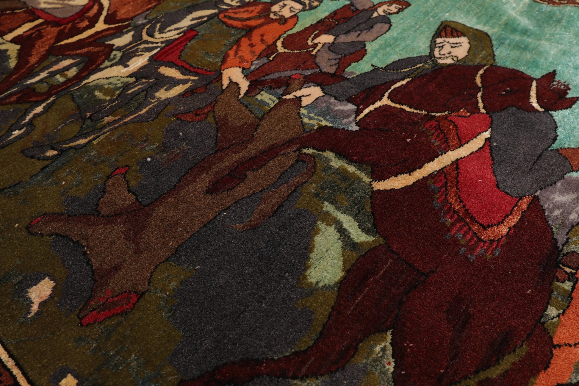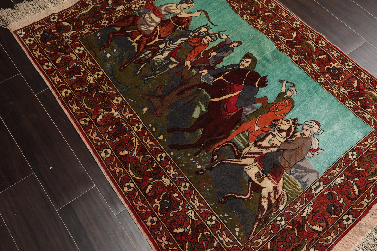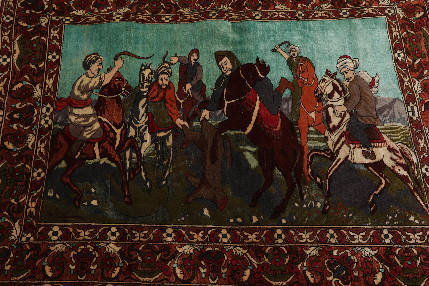 This is a beautiful vintage rug with 300 knots per square inch. It portrays a hunting scene that looks vivid and real. Organic vegetable dyes and high quality wool used in the the rug have added to the durability of the rug and make it withstand the tides of time. Truly a marvel!