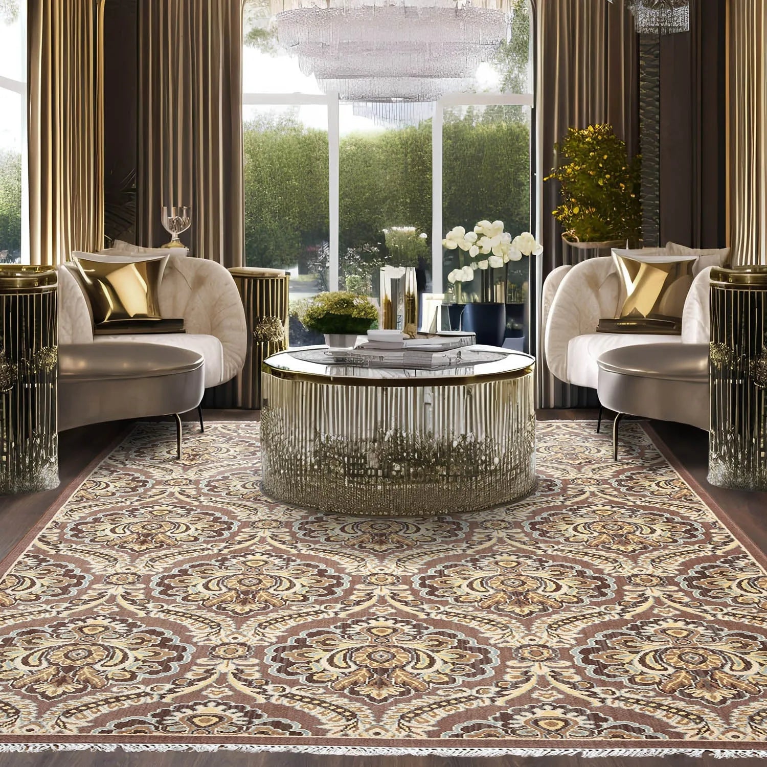 This is a beautiful 6'x9' Light and Dark Brown, Aqua, Beige, Gold, Multi Color Machine Made Karastan Look and Quality Persian Oriental Wool Rug. Its elegant style is easy to decorate with and perfect for living room, dining room, bed room or anywhere in t