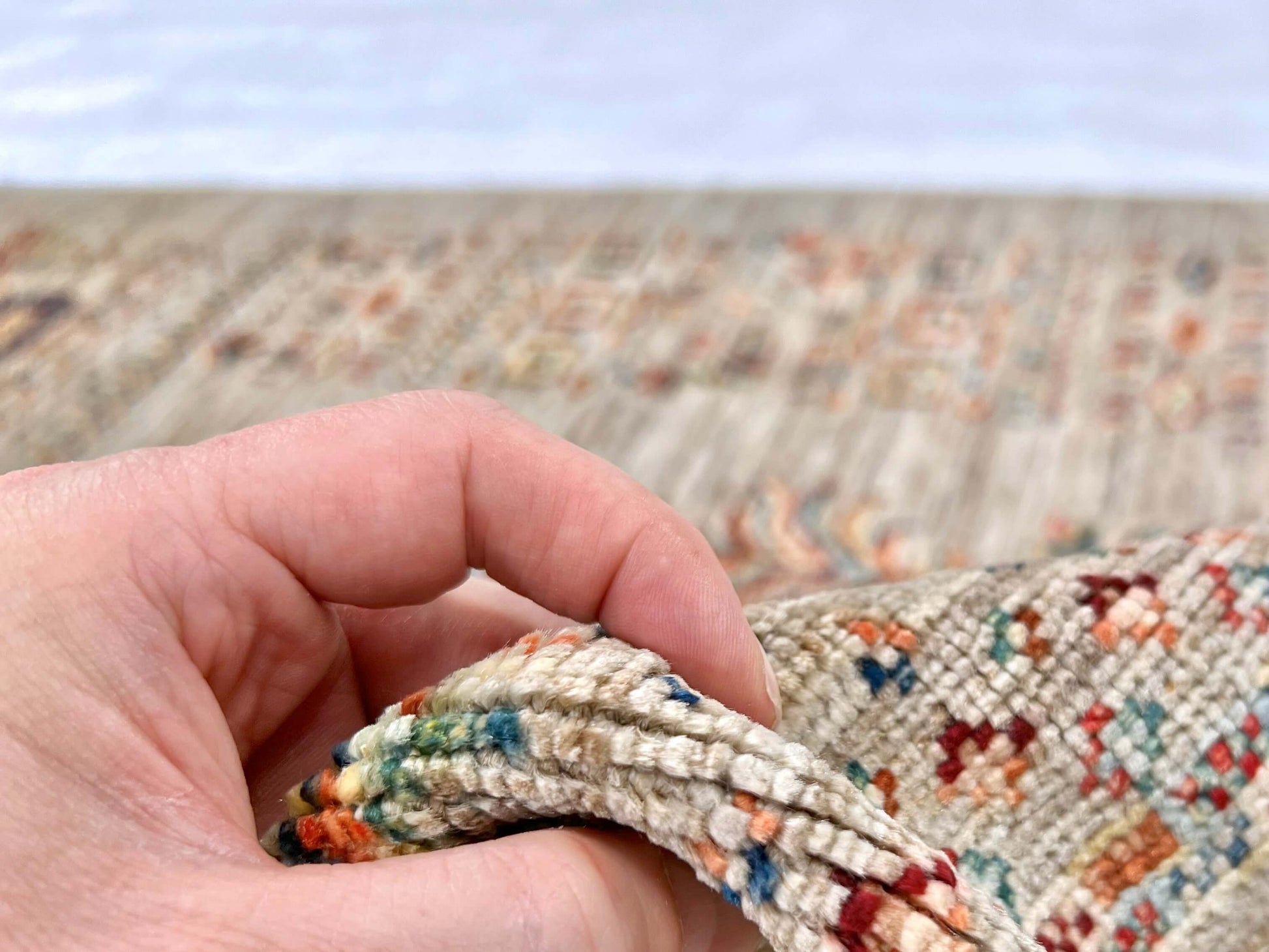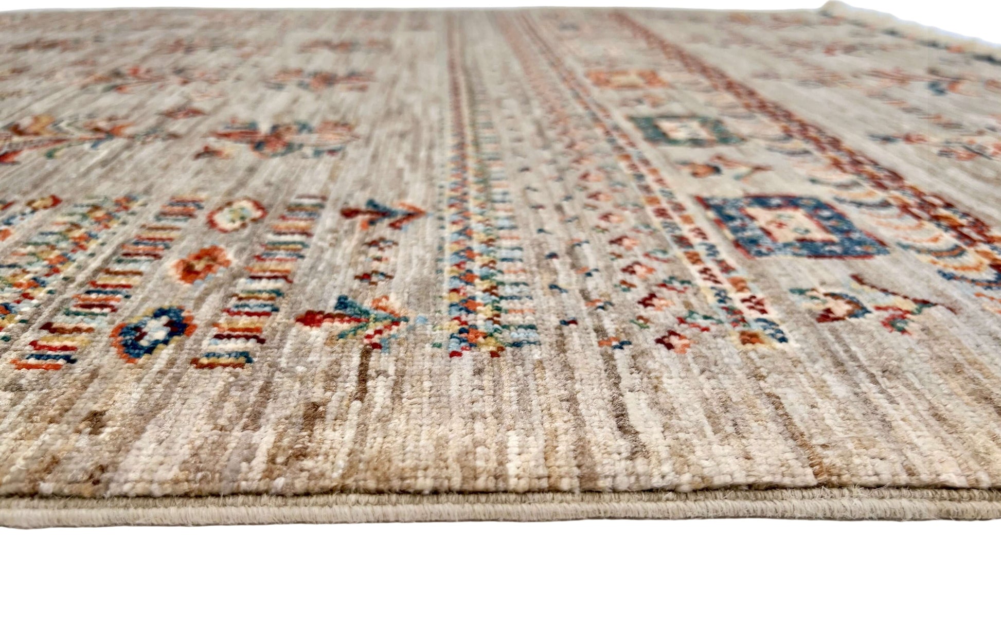 Expertly crafted from natural, undyed Ghazni wool and vegetable dyed for lasting vibrancy, our Afghan Khorjin displays a delightful folk design. Hand-knotted in Afghanistan, this 3x5 piece is both an eye-catching decor accent and a testament to traditional artistry.