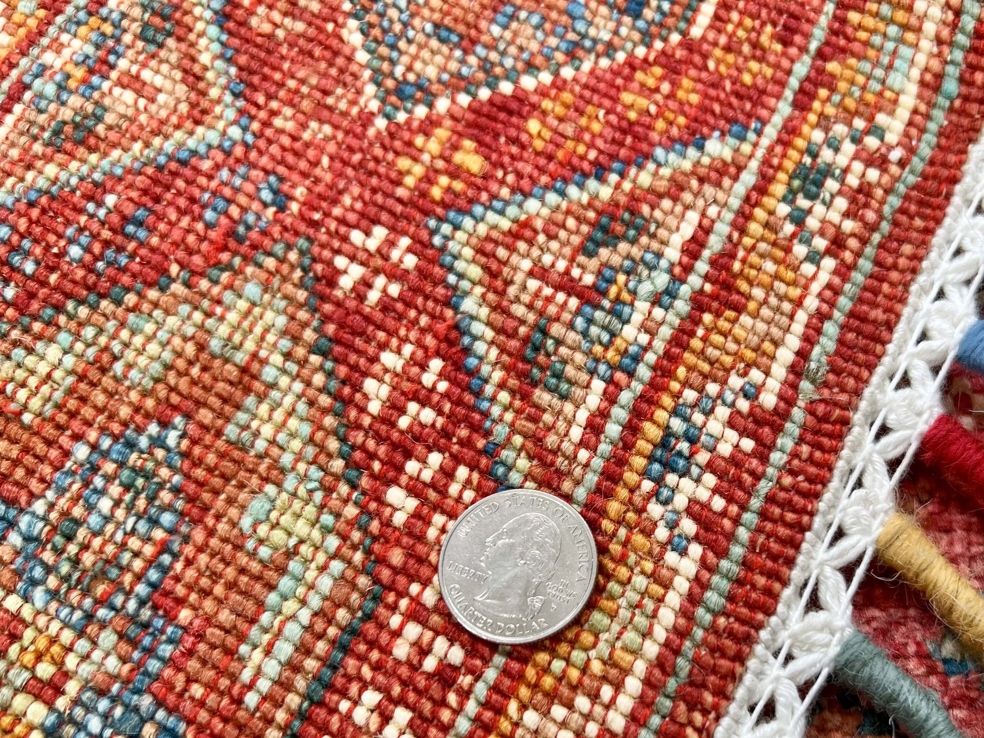 Introducing the Afghan Khorjin-Gabbeh rug. Hand knotted from 100% Ghazni wool, this nomadic Persian design features vegetable dyes, ensuring its rust/red colors stay vibrant for years. Plus, the tasseled fringe adds a touch of traditional charm. Experience expert craftsmanship and authentic style.