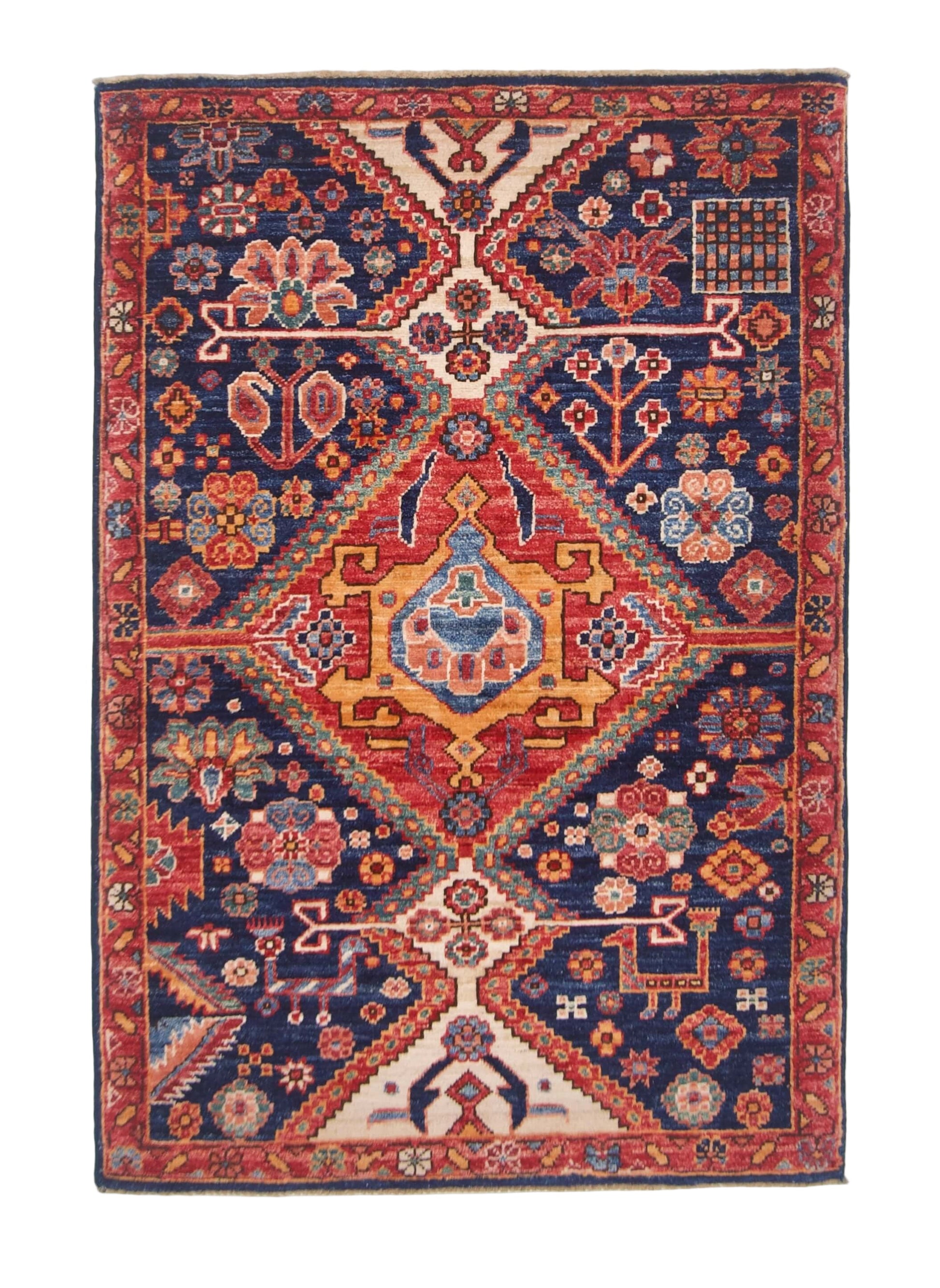 This Afghan rug is expertly hand knotted with Ghazni wool, known for its durability and softness. Its traditional, Persian Qashqai design is made with vegetable dyes, giving it vibrant and long-lasting colors. Measuring at 2'08"x3'10", it is a perfect addition to any home, adding a touch of elegance and culture.