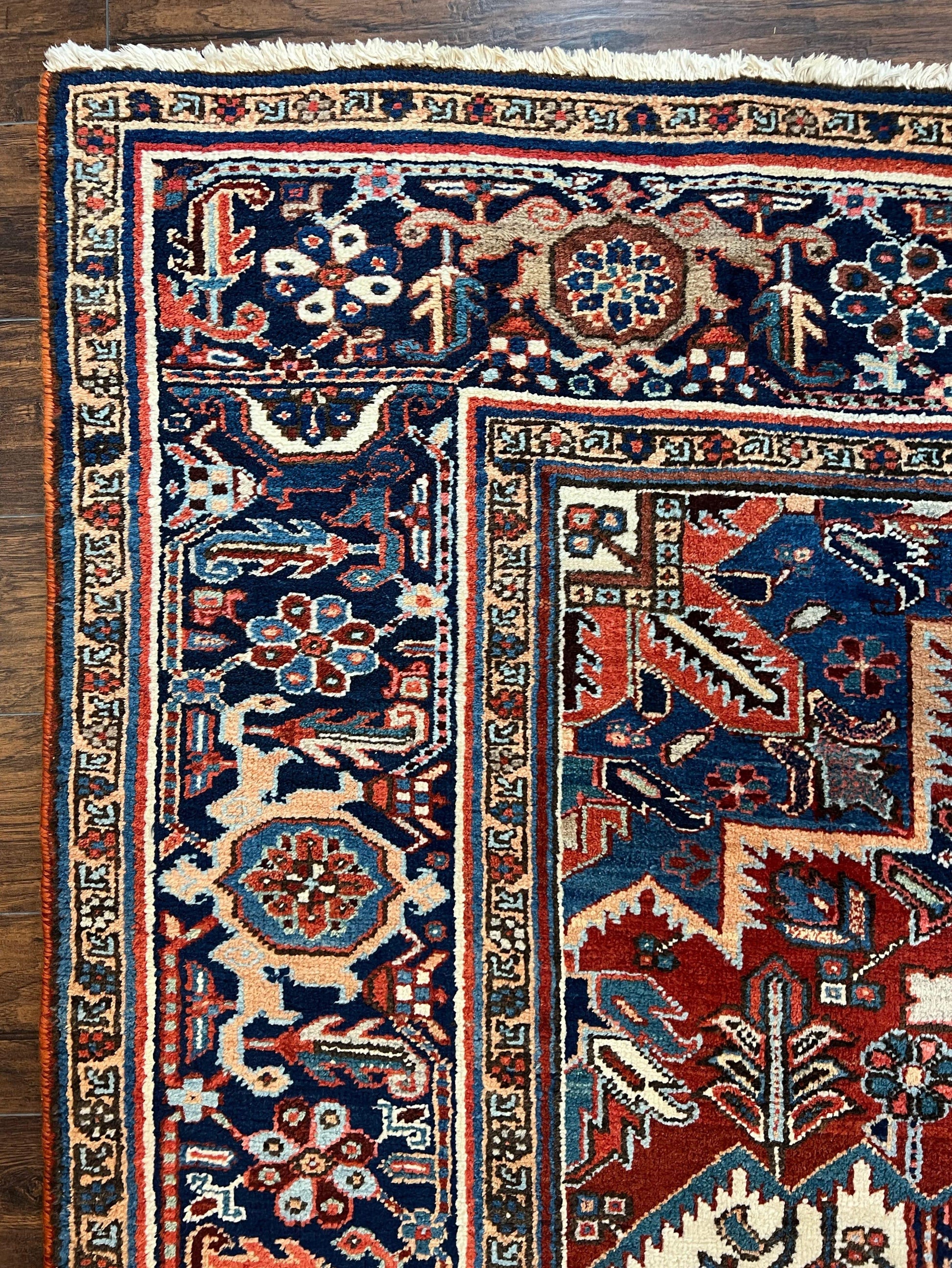 This magnificent 1920s Persian Heriz rug is a true statement piece, boasting a grand 11x16 palace size that makes it perfect for large spaces. Featuring a bold central medallion with intricate geometric motifs, this rug showcases the unmistakable craftsmanship of antique Heriz weavings. The rich rust red, deep navy, ivory, and soft blue hues create a striking contrast, while the intricate floral and angular vine patterns add layers of depth. The strong, durable wool pile ensures longevity, making it both a luxurious and practical addition to any home.