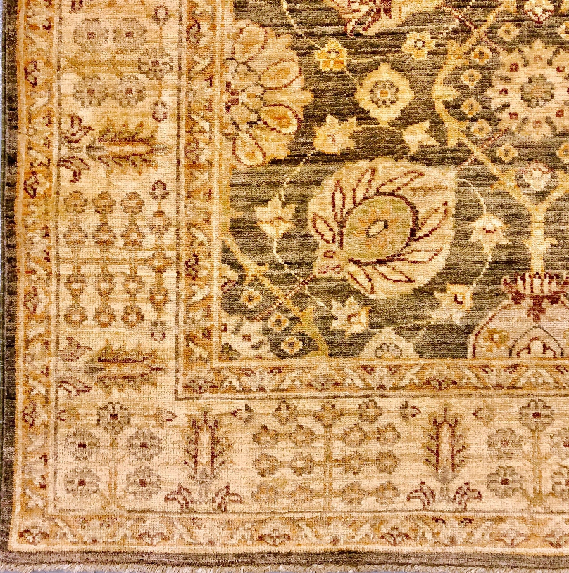 Tea-washed Chobi design with Cypress tree border – Unique, wide runner – hand-knotted of hand-spun vegetable-dyed Ghazni wool in Afghanistan; tea washed and exported from Pakistan